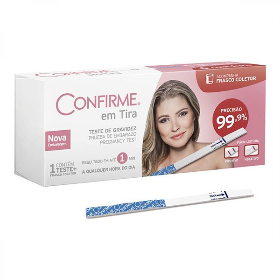 Produto Original O teste de gravidez Confirme em tira é um teste seguro, fácil e rápido para detecção de HCG na urina, de qualquer hora do dia, a partir do primeiro dia de atraso da menstruação. Contém um coletor de urina, 1 tira teste e um saquinho com descarte, para conservação da tira teste, e um folheto com instrução de uso. O resultado é obtido em 5 minutos.