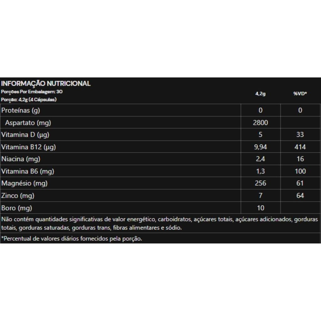 Descrição do Produto: - Testo Cycle da Under Labz é um suplemento alimentar desenvolvido com nutrientes que auxiliam no metabolismo energético, na função muscular e no bom funcionamento do organismo. Sua fórmula combina 2800 mg de Ácido D-Aspártico por dose com minerais como Magnésio, Zinco e Boro, além das vitaminas D, B6, B12 e Niacina, que desempenham papéis importantes em diversos processos fisiológicos. Como Consumir: - Consumir 4 cápsulas ao dia, preferencialmente junto às principais refeições, ou conforme orientação de profissional da saúde. Benefícios: - Contém Ácido D-Aspártico. - Com vitaminas e minerais que auxiliam no metabolismo energético. - Contribui para a função muscular e imunológica. - Fonte de Magnésio, Zinco, Boro e Vitaminas D, B6, B12 e Niacina. Alergênicos: - Pode conter derivados de leite e ovo. - Não contém glúten. Ingredientes: - Ácido L-aspártico, óxido de magnésio, cianocobalamina, óxido de zinco, colecalciferol, nicotinamida, cloridrato de piridoxina, tetraborato de sódio, antiumectante dióxido de silício, corantes azul brilhante FCF, eritrosina e tartrazina, gelificante gelatina, lubrificante estearato de magnésio. Advertências: - Produto indicado para adultos a partir de 19 anos. - Este produto não é um medicamento. - Mantenha fora do alcance de crianças. - Não deve ser consumido por gestantes, lactantes e crianças. - Não exceder a recomendação diária de consumo indicada na embalagem. - Em caso de condições de saúde ou uso de medicamentos, consulte um profissional da saúde. - Armazenar em local fresco, seco e protegido da luz.