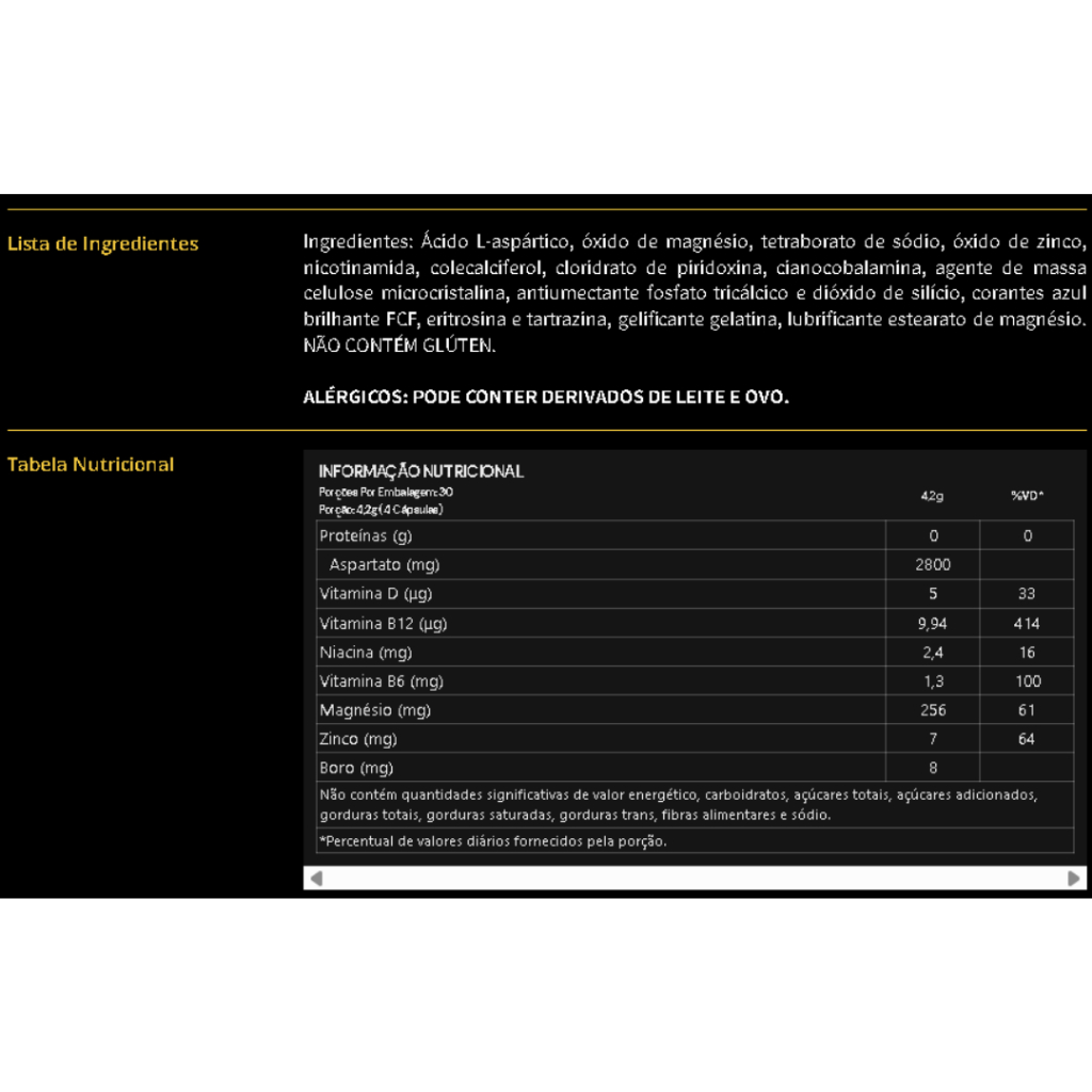 Testo Cycle é um suplemento inovador para atletas masculinos que desejam obter melhor performance no dia a dia. Todos esses nutrientes auxiliam no ganho de massa muscular, favorecendo o processo de hipertrofia, além de ajudar na melhora da libido e rendimento. As vitaminas e minerais presentes em Testo Cycle contribuem para o fortalecimento do sistema imune. ------------------ Benefícios ------------------ → Melhora dos rendimento nos treinos → Melhora na libido → Ideal para hipertrofia → Promove ganho de massa muscular → Fortalece o sistema imunológico ----------------------------- Sugestão De Uso ----------------------------- Consumir 3 tabletes ao dia, preferencialmente a noite antes de dormir ou conforme recomendação profissional. --------------------- Ingredientes --------------------- Ácido L-aspártico, óxido de magnésio, tetraborato de sódio, óxido de zinco, nicotinamida, colecalciferol, cloridrato de piridoxina, cianocobalamina, agente de massa celulose microcristalina, antiumectante fosfato tricálcico e dióxido de silício, corantes azul brilhante FCF, eritrosina e tartrazina, gelificante gelatina, lubrificante estearato de magnésio. NÃO CONTÉM GLÚTEN. ALÉRGICOS: PODE CONTER DERIVADOS DE LEITE E OVO.
