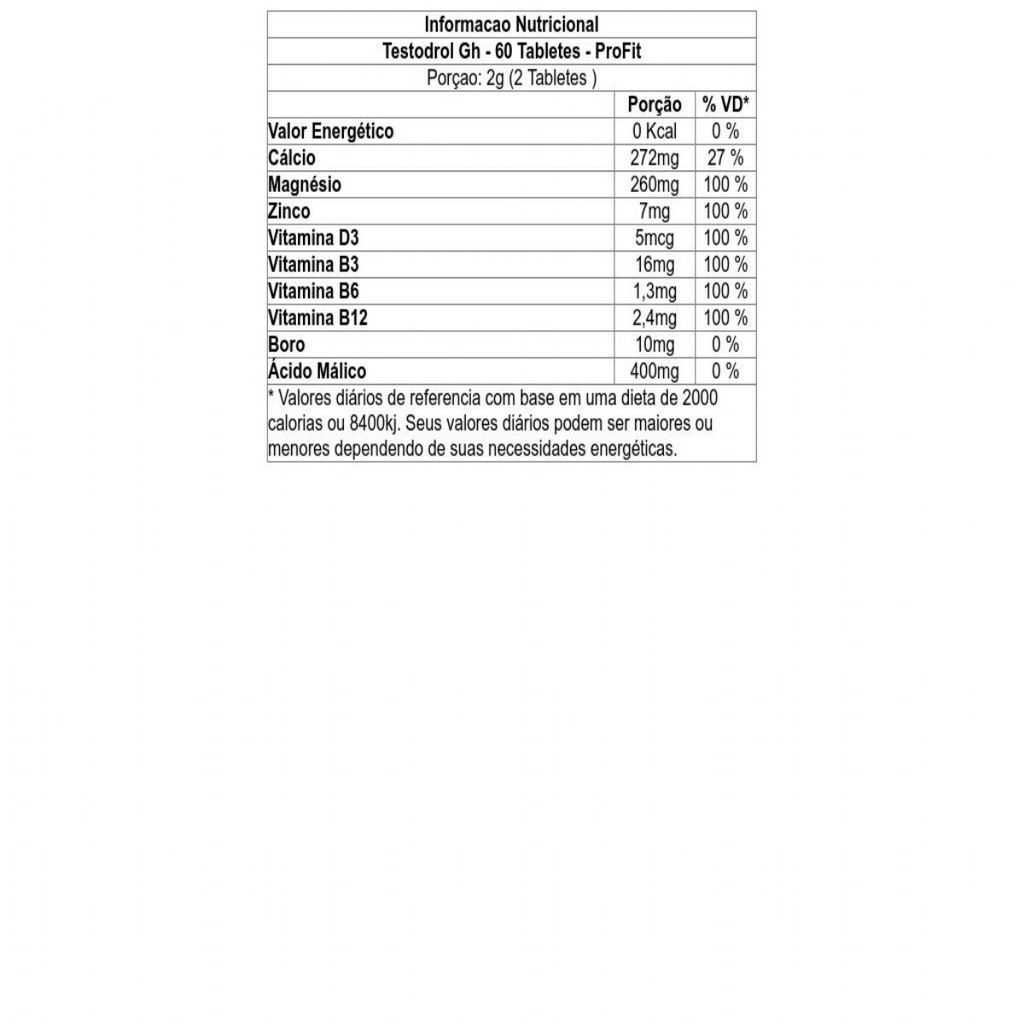 Testodrol é um suplemento avançado, desenvolvido pela ProFit Laboratórios, que se destaca por sua fórmula única e poderosa. Este produto é composto por um complexo de vitaminas e minerais, incluindo Magnésio, Boro, Zinco, Vitaminas B3, D3, B6 e B12. Como Tomar Ingerir 2 tabletes ao dia ou de acordo com seu médico ou nutricionista. ESTE PRODUTO NÃO DEVE SER CONSUMIDO POR CRIANÇAS, GESTANTES E PORTADORES DE ENFERMIDADES. ESTE PRODUTO NÃO SUBSTITUI UMA ALIMENTAÇÃO EQUILIBRADA E SEU CONSUMO DEVE SER ORIENTADO POR NUTRICIONISTA OU MÉDICO. Ingredientes Carbonato de Cálcio, Óxido de Magnésio, Ácido Bórico, Nicotinamida, Óxido de Zinco, Cianocobalanina, Niacina, Cloridato de Piridoxina, fosfato tricálcico, celulose microcristalina, dióxido de silício, estearato de magnésio e carboximetilcelulose. NÃO CONTÉM GLÚTEN. ...