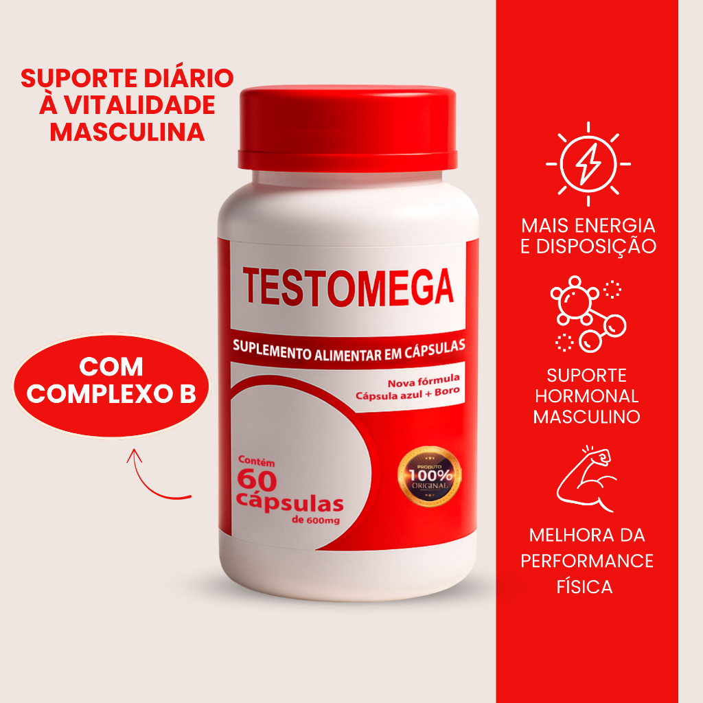 Experimente uma nova dimensão de vitalidade e bem-estar com Testomega, o suplemento que combina o poder das vitaminas do complexo B, Boro, Zinco, fitomenadioma e Biotina para otimizar seu desempenho diário e melhorar sua qualidade de vida. O complexo B é um grupo de vitaminas solúveis em água, essenciais para o funcionamento adequado do corpo humano. Cada vitamina do complexo B desempenha funções específicas, sendo fundamental para diversos processos metabólicos que afetam diretamente sua energia, humor e saúde geral. Benefícios Adicionais de Boro e Biotina: Testomega - Sua Escolha Confiável: Nossa fórmula é cuidadosamente elaborada com ingredientes premium, selecionados rigorosamente para garantir máxima eficácia e segurança. Priorizamos a qualidade e a confiabilidade do nosso produto para garantir que você obtenha os melhores resultados possíveis. Com Testomega, diga adeus ao cansaço e dê as boas-vindas à vitalidade e vigor renovados. Apresentado em cápsulas fáceis de engolir, Testomega é extremamente prático e fácil de incorporar à sua rotina diária. Recomendamos o uso de 2 cápsulas por dia, acompanhadas de um copo de água, para obter o máximo benefício. ADVERTÊNCIAS: Crianças, gestantes, idosos e portadores de qualquer enfermidade devem consultar o médico e/ou nutricionista. Conservação Após aberto, manter a embalagem bem fechada e armazenar em local fresco, seco (15° a 25°) e ao abrigo de luz. Produto lacrado para sua proteção. Não utilizar em caso de violação. Recomendação acima de 18 anos ou por orientação médica Este produto não é um medicamento. Este produto é um suplemento alimentar. Deve ser mantido fora do alcance de crianças e animais. Dispensado de registro no Ministério da Saúde conforme RDC Anvisa 240/18