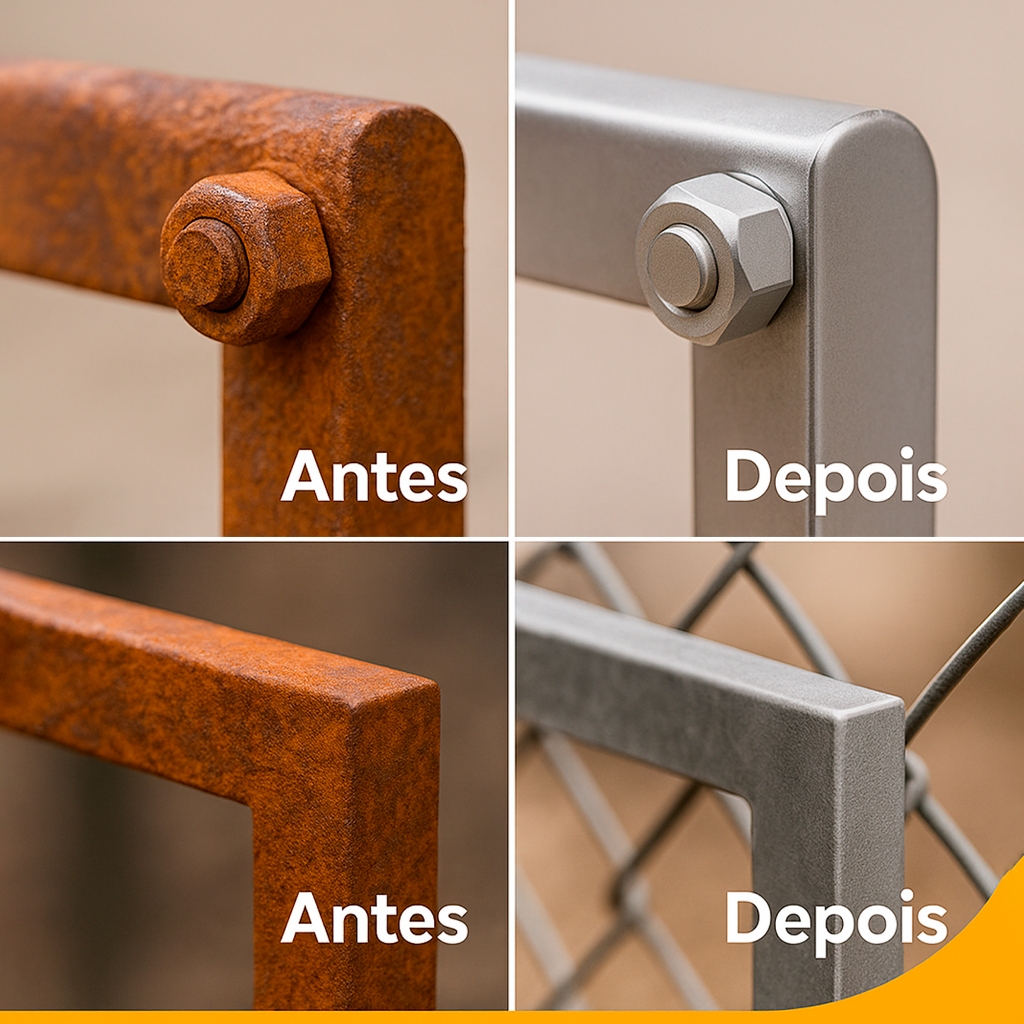 Convertedor de Ferrugem CF-TF7 – Pronto para Usar e Altamente Eficaz * Elimina a ferrugem e prepara a superfície para pintura * Forma película protetora que evita nova corrosão * Pronto para uso: em 2 horas já pode aplicar tinta ou verniz * Rende de 8 a 12 m² por litro, ideal para uso doméstico ou profissional * Substitui removedores, lixamento e jateamento * Pode ser aplicado em ferro, zinco, cobre e outros metais --- Informações complementares * Conteúdo: 100ml, 200ml, 300ml (Com Spray), 500ml, 1 litro, 1 litro + 300ml (Com Spray) * Marca: TF7 * Indicado para superfícies metálicas com ferrugem * Aplicação rápida, segura e com excelente cobertura * Ideal para portões, grades, estruturas metálicas e peças industriais * Super Shop garante envio rápido e suporte pós-venda