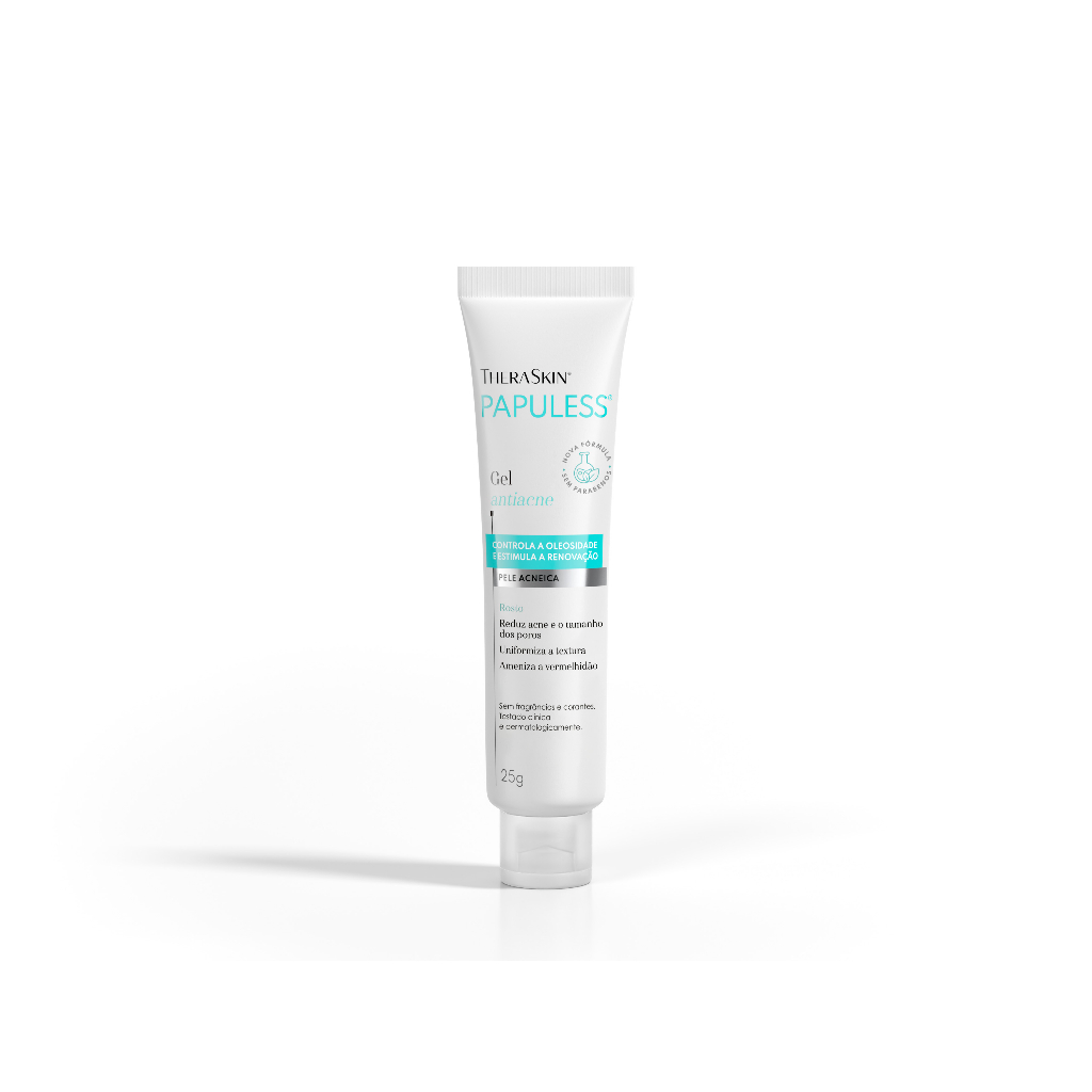 Theraskin Papuless - Gel Antiacne 25g O Papuless® gel antiacne auxilia no combate às pápulas (acnes). A acne é o nome dado a espinhas e cravos que surgem devido a um processo inflamatório das glândulas sebáceas e dos folículos pilossebáceos. É muito frequente na fase da adolescência, sem deixar de ser comum também em adultos, principalmente em mulheres. Além do incômodo das lesões, como na adolescência a aparência é um fator importante, o comprometimento estético determinado por alterações da pele pode atingir o lado psicológico e tornar o adolescente inseguro, tímido, deprimido, infeliz, com rebaixamento da autoestima e com consequências sérias que podem persistir pelo resto da vida. (Fonte: Sociedade Brasileira de Dermatologia) Indicado para todos os tipos de pele, o Papuless® gel antiacne é formulado à base de nicotinamida, um derivado ativo da vitamina B3 com ação anti-inflamatória, que melhora a textura e uniformiza a tonalidade da pele. Como Usar Com a pele devidamente limpa e higienizada, aplique o Papuless® Gel Antiacne de uma forma uniforme em toda a superfície afetada. Repita o processo 2 vezes ao dia ou conforme orientação médica. É importante manter a regularidade do uso do gel antiacne e uniformizador Papuless® para não comprometer os resultados. Para que a limpeza da pele seja feita adequadamente, é indicado o uso de um sabonete para o seu tipo de pele, como o Theracne® Sabonete Antiacne para Pele Oleosa.