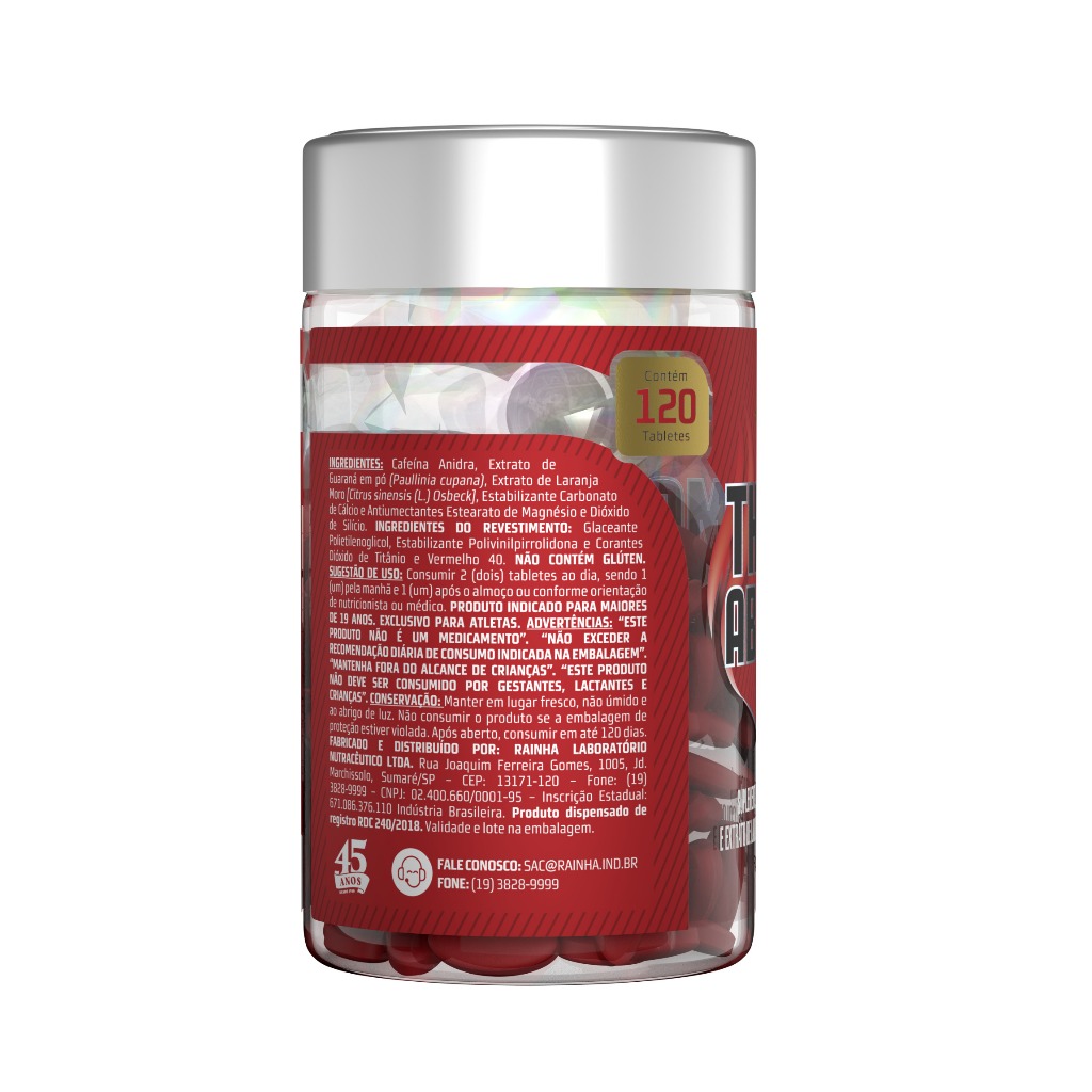THERMO ABDOMEN INGREDIENTES: Cafeína, Extrato de Guaraná em pó (Paullinia cupana), Citrus sinensis (L.) Osbeck, Estabilizante Carbonato de Cálcio e Antiumectantes Estearato de Magnésio. INGREDIENTES DO REVESTIMENTO: Glaceante Polietilenoglicol, Estabilizante Polivinilpirrolidona e Corantes Dióxido de Titânio e Vermelho 40. NÃO CONTÉM GLÚTEN. SUGESTÃO DE USO: Consumir 2 (dois) tabletes ao dia, sendo 1 (um) pela manhã e 1 (um) após o almoço ou conforme orientação de nutricionista ou médico. PRODUTO INDICADO PARA MAIORES DE 19 ANOS. EXCLUSIVO PARA ATLETAS. ADVERTÊNCIAS: “ESTE PRODUTO NÃO É UM MEDICAMENTO”. “NÃO EXCEDER A RECOMENDAÇÃO DIÁRIA DE CONSUMO INDICADA NA EMBALAGEM”. “MANTENHA FORA DO ALCANCE DE CRIANÇAS”. “ESTE PRODUTO NÃO DEVE SER CONSUMIDO POR GESTANTES, LACTANTES E CRIANÇAS”. CONSERVAÇÃO: Manter em lugar fresco, não úmido e ao abrigo de luz. Não consumir o produto se a embalagem de proteção estiver violada. Após aberto, consumir em até 24 horas.