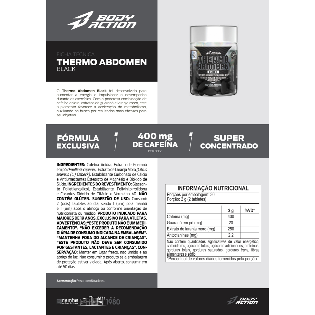THERMO ABDOMEN BLACK® INGREDIENTES: Cafeína Anidra, Extrato de Guaraná em pó, Extrato de Laranja Moro (Citrus sinensis (L.) Osbeck), Estabilizante Carbonato de Cálcio e Antiumectantes Estearato de Magnésio e Dióxido de Silício. INGREDIENTES DO REVESTIMENTO: Glaceante Polietilenoglicol, Estabilizante Polivinilpirrolidona e Corantes Dióxido de Titânio e Vermelho 40. NÃO CONTÉM GLÚTEN. SUGESTÃO DE USO: Consumir 2 (dois) tabletes ao dia, sendo 1 (um) pela manhã e 1 (um) após o almoço ou conforme orientação de nutricionista ou médico. PRODUTO INDICADO PARA MAIORES DE 19 ANOS. EXCLUSIVO PARA ATLETAS. ADVERTÊNCIAS: “ESTE PRODUTO NÃO É UM MEDICAMENTO”. “NÃO EXCEDER A RECOMENDAÇÃO DIÁRIA DE CONSUMO INDICADA NA EMBALAGEM”. “MANTENHA FORA DO ALCANCE DE CRIANÇAS”. “ESTE PRODUTO NÃO DEVE SER CONSUMIDO POR GESTANTES, LACTANTES E CRIANÇAS”. CONSERVAÇÃO: Manter em lugar fresco, não úmido e ao abrigo de luz. Não consumir o produto se a embalagem de proteção estiver violada. Após aberto consumir em até 60 dias.