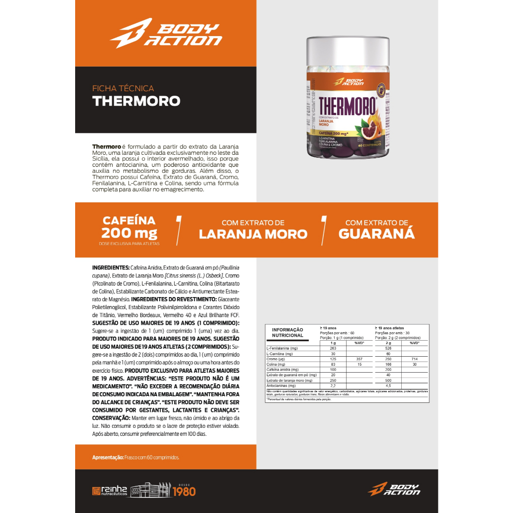 THERMORO® A cafeína auxilia no aumento da capacidade de resistência e no desempenho de exercícios físicos de resistência; A colina contribui para o metabolismo lipídico; Extrato de Laranja Moro 500mg (2 comprimidos); INGREDIENTES: Cafeína Anidra, Extrato de Guaraná em pó (Paullinia cupana), Extrato de Citrus sinensis (L.) Osbeck, Cromo (Picolinato de Cromo), L-Fenilalanina, L- Carnitina, Colina (Bitartarato de Colina), Estabilizante Carbonato de Cálcio e Antiumectante Estearato de Magnésio. INGREDIENTES DO REVESTIMENTO: Glaceante Polietilenoglicol, Estabilizante Poli-vinilpirrolidona e Corantes Dióxido de Titânio, Vermelho Bordeaux, Vermelho 40 e Azul Brilhante FCF. SUGESTÃO DE USO ≥ 19 ANOS (1 COMPRIMIDO): Sugere-se a ingestão de 1 (um) com-primido 1(uma) vez ao dia. PRODUTO INDICADO PARA MAIORES DE 19 ANOS. SUGESTÃO DE USO ≥ 19 ANOS ATLETAS (2 COMPRIMIDOS): Sugere-se a ingestão de 2 (dois) comprimidos ao dia, 1(um) comprimido pela manhã e 1(um) comprimido após o almoço ou uma hora antes do exercício físico. PRODUTO EXCLUSIVO PARA ATLETAS MAIORES DE 19 ANOS. ADVERTÊNCIAS: “ESTE PRODUTO NÃO É UM MEDICAMENTO”. “NÃO EXCEDER A RE-COMENDAÇÃO DIÁRIA DE CONSUMO INDICADA NA EMBALAGEM”. “MANTENHA FORA DO ALCANCE DE CRIANÇAS”. “ESTE PRODUTO NÃO DEVE SER CONSUMIDO POR GESTANTES, LACTANTES E CRIANÇAS. CONSERVAÇÃO: Manter em lugar fresco, não úmido e ao abrigo da luz. Não consumir o produto se o lacre de proteção estiver violado. Após aberto, consumir preferencialmente em 100 dias.