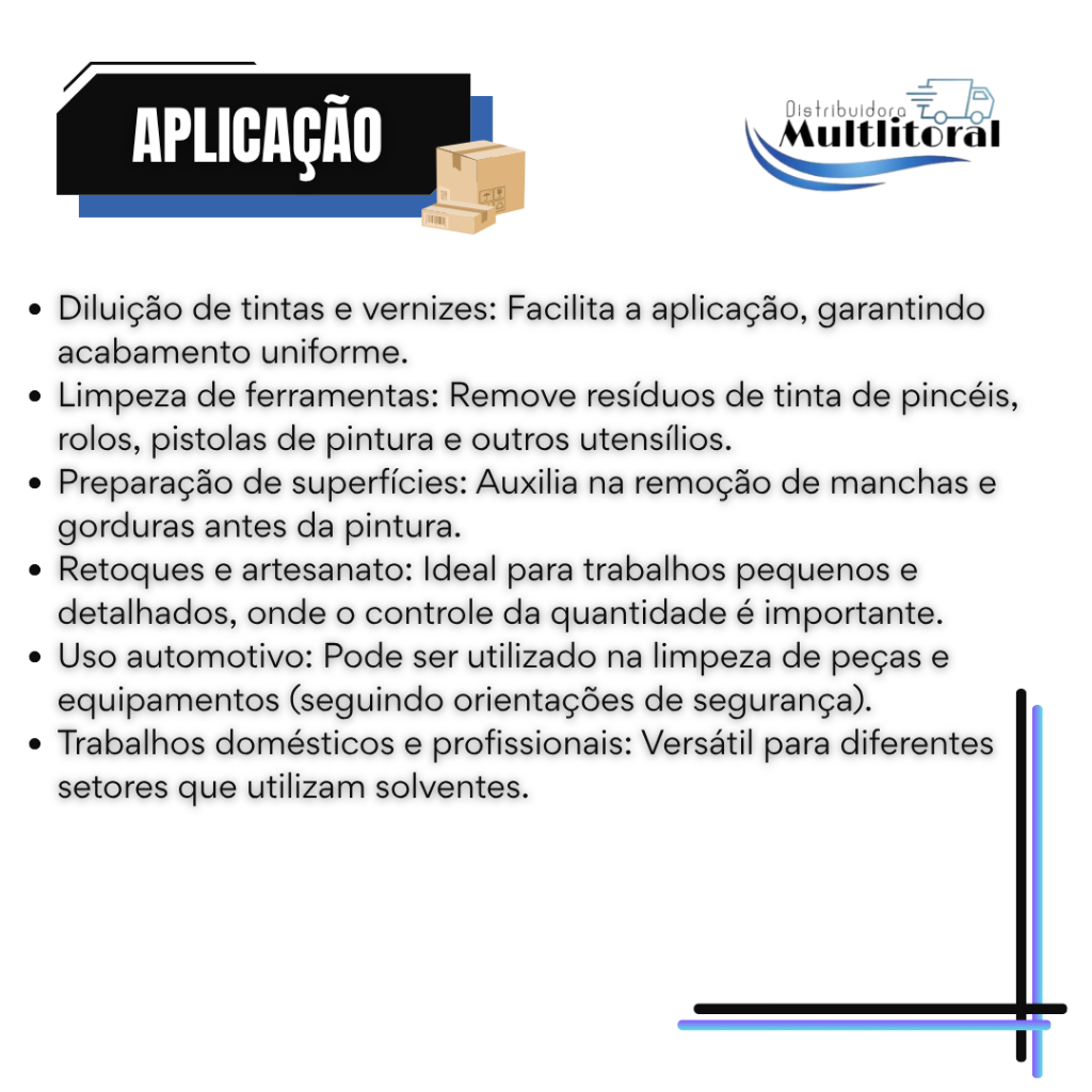 Marca: Itaquá Volume: 90ml Composição: Solventes orgânicos de alta qualidade. Função principal: Diluição de tintas, vernizes e esmaltes sintéticos. Ação de limpeza: Remove resíduos de tinta e limpa ferramentas de pintura como pincéis, rolos e pistolas. Evaporação rápida: Facilita secagem e agiliza o processo de aplicação. Versatilidade: Pode ser usado em trabalhos artesanais, domésticos e profissionais. Armazenamento: Embalagem resistente e prática para uso controlado. Cor: Líquido transparente. Odor característico: Forte, típico de solventes.