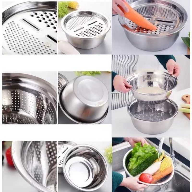 Tigela Inox 3 Em 1 Ralador Fatiador Escorredor Bacia Legumes Queijo Manual 26cm Cozinha Prática