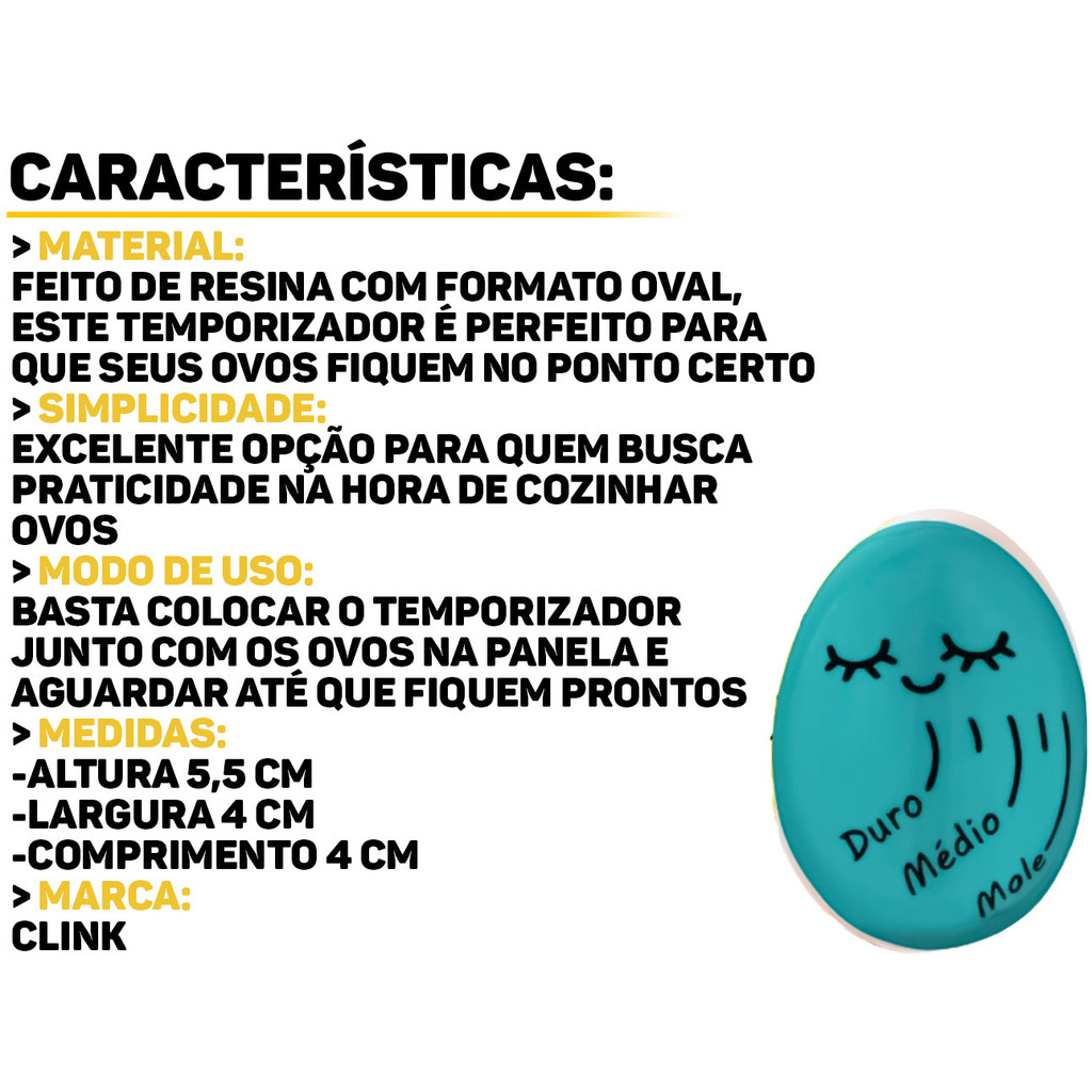 Timer Em Resina Para Ovos Clink Ideal para quem busca praticidade e precisão na cozinha. Produzido em resina, este timer foi desenvolvido especialmente para o preparo de ovos cozidos. Com design divertido e funcional, ele permite que você controle o tempo de cozimento com facilidade, garantindo ovos no ponto exato. Características: > Atóxico; > Produzido com resinas específicas; > Sua cor interna muda indicando os estágios de cozimento do ovo. Especificações Técnicas: > Material: resina não tóxica; > Dimensões (C x L): 5,5cm x 4cm. - Marca: Clink - Garantia: 90 dias contra defeitos de fabricação Vantagens de comprar na Brester: - Produto a pronta entrega. - Produto novo, com garantia de fábrica. - Nota fiscal para Pessoa Física e Pessoa Jurídica.