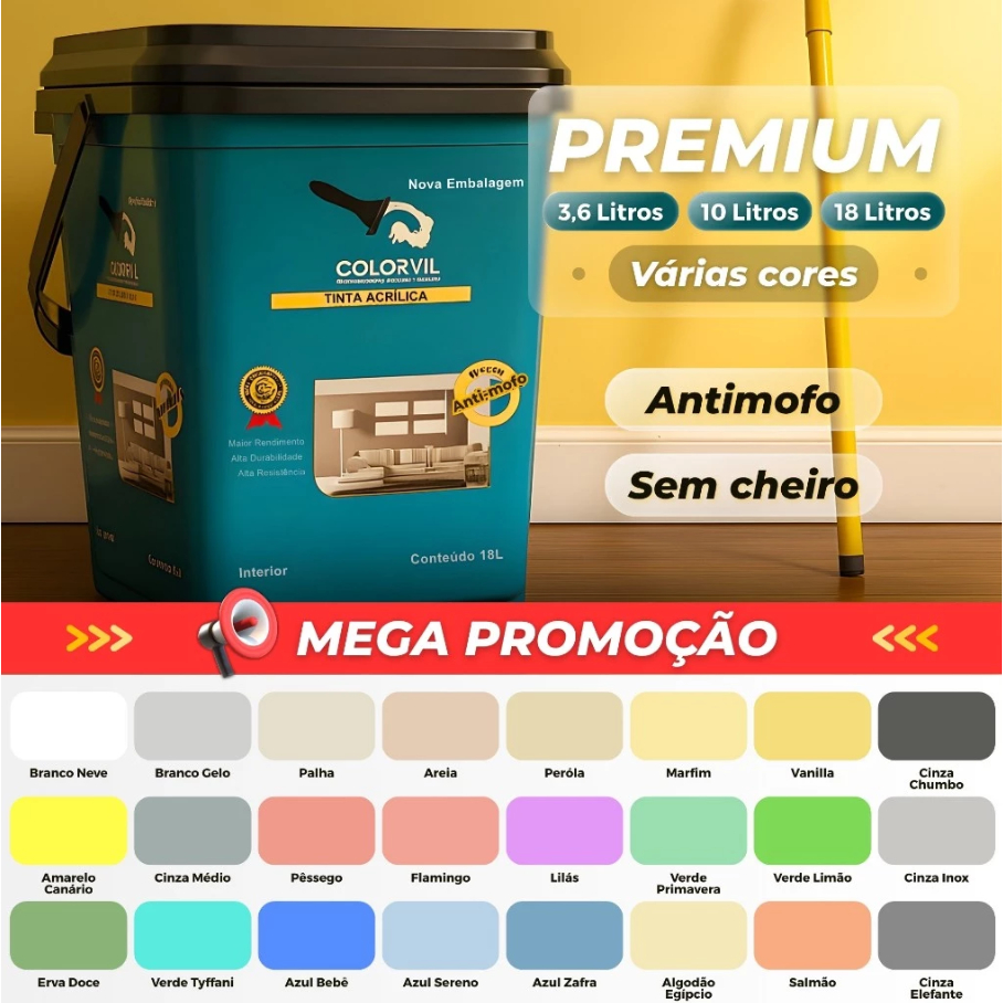 Colorvil – Tinta Interna econômica A Colorvil é a solução definitiva para infiltrações e umidades, proporcionando máxima proteção e durabilidade para suas superfícies. Uso Interno Formulada com tecnologia avançada. Disponível em diversas cores Embalagem de 13 kg – cobertura de até 100m² por demão Onde Aplicar A Colorvil pode ser aplicada em diversas superfícies, incluindo: Reboco Massa corrida ou acrílica Gesso e Drywall Concreto e Fibrocimento Telhados e coberturas (incluindo telhas zincadas ou galvanizadas) Áreas com manchas de gordura, graxa ou mofo (necessário limpeza adequada antes da aplicação) Para outras superfícies ou dúvidas, entre em contato com nosso Serviço de Atendimento ao Cliente (SAC) para orientações detalhadas. Como Aplicar Para garantir máxima aderência e qualidade, siga a Norma ABNT NBR 13.245 e certifique-se de que a superfície esteja: Limpar: livre de poeira, gordura, óleo e qualquer substância que comprometa a aderência. Seca: sem umidade excessiva. Lixada: especialmente em superfícies previamente pintadas ou irregulares. Isenta de contaminantes: sem ferrugem, partículas soltas ou restos de pintura antiga. 1. Preparação da Superfície Reboco, Concreto e Fibrocimento: devem estar limpos, secos e nivelados. Superfícies com Imperfeições: corrigir fissuras e irregularidades com massa apropriada antes da aplicação. Telhados e Coberturas: remover resíduos de óleo, gordura e corrosão. Superfícies Metálicas: lixar para remover ferrugem e impurezas. Gesso e Drywall: aplicar um fundo preparador antes da tinta. Áreas com Gordura, Graxa ou Mofo: lavar bem com detergente ou água sanitária e aguardar a secagem. 2. Ferramentas Indicadas Rolo de lã baixa Rolo de textura Brocha, pincel ou trincha Pistola para pintura e airless 3. Diluição Correta Para garantir uma aplicação uniforme, siga a diluição recomendada 1ª demão: Pronto para uso. Demais demãos: Pronto para uso. Misture bem a Colorvil antes e durante o uso para manter a consistência homogênea. 4. Tempo de Secagem Ao toque: cerca de 2 horas Entre demãos: 3 a 4 horas Cura completa: 72 horas (após esse período, o efeito hidrorepelente será totalmente ativado) Para melhores resultados, aplique em temperaturas entre 16°C e 40°C, evitando dias muito úmidos ou chuvosos. 5. Rendimento (2 a 3 demãos) Estimativa de cobertura: 2 demão 13 kg podem cobrir até 100m² por demão O rendimento pode variar conforme a superfície e a técnica de aplicação. 🏡 Proteja e impermeabilize com a qualidade Colorvil!