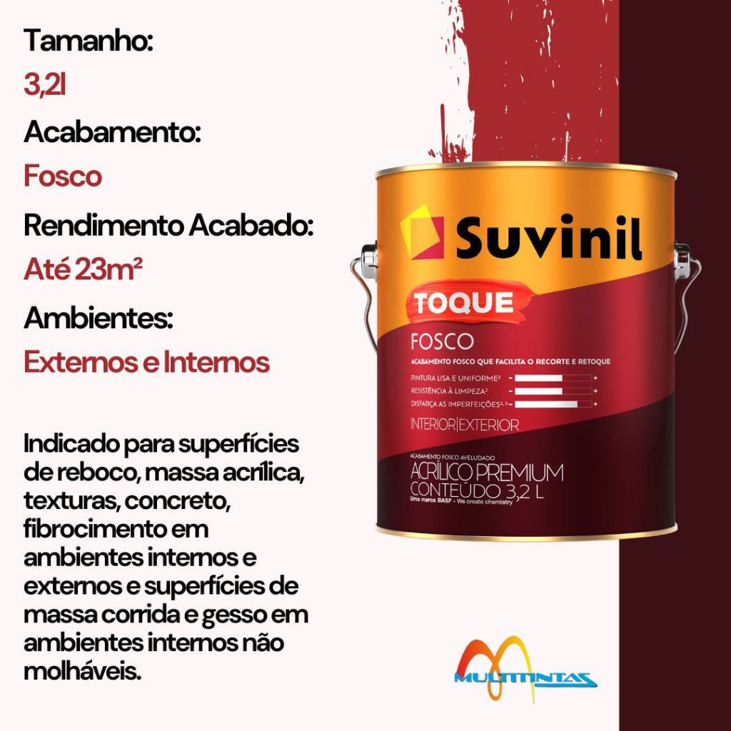 🎨 COR CAPIM DE CHEIRO – SUVINIL TOQUE FOSCO 🌿💬 Quer uma cor que não está no anúncio? Envie uma mensagem pra gente!A Suvinil Toque Fosco é a tinta mais tradicional da marca e a preferida dos pintores.✔ Alta cobertura e versatilidade na aplicação✔ Sem cheiro – perfeita para ambientes internos✔ Fácil de aplicar e disponível em diversas cores✔ Pode ser usada dentro e fora de casaAcabamento: FoscoSecagem:Ao toque: 2hEntre demãos: 4hFinal: 12hRendimento: Até 23m² Demãos: 2 a 3Diluição:Primeira pintura (massa corrida, acrílica, drywall, gesso): 30% de água potávelRepintura (concreto, blocos, fibrocimento, texturas, reboco): 30% de água potávelAirless: 30% de água potável por litro | Pressão: 1200 a 1400 psi | Bico: 0,017” | Velocidade: 9 a 11 m²/min💡 Atenção: As cores nas imagens são ilustrativas e podem variar conforme o dispositivo ou iluminação do ambiente.