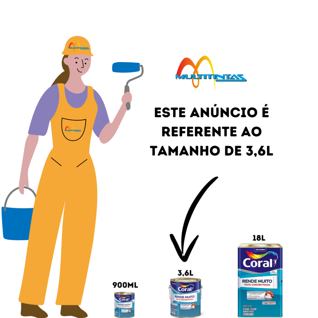 Coral RENDE MUITO é a tinta concentrada que permite diluição superior aos produtos convencionais, graças à sua exclusiva tecnologia TIXOPLUS™. O resultado é um rendimento muito maior, com ótima cobertura e baixo odor, para pintar muito mais com a qualidade que você já conhece e confia.Aplicação com rolo de lã de pelo baixo ou pincel de cerdas macias.SecagemAo toque: 30minEntre demãos: 4hFinal: 4hNúmero de demãos: 3Cor: Branco Conteúdo: 3,6lRendimento acabado: Até 34m²