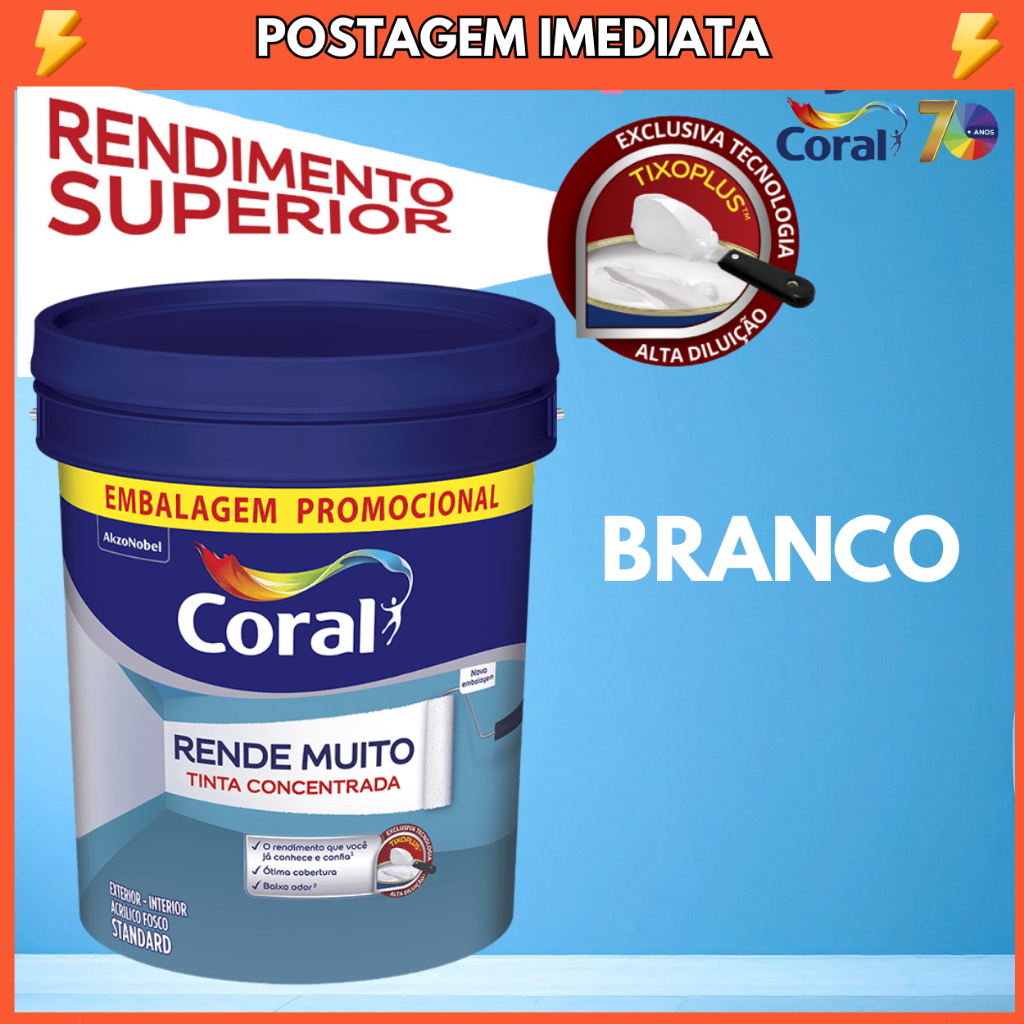 Tinta Coral Rende Muito Branco 20L – Máximo Rendimento e Cobertura .............................................................................. Transforme seus ambientes com a Tinta Acrílica Fosca Coral Rende Muito. Desenvolvida com fórmula de alta tecnologia, oferece excelente rendimento, maior cobertura e acabamento impecável, podendo ser utilizada tanto em áreas internas quanto externas. -DESCRIÇÃO DO PRODUTO Marca: Coral Linha: Rende Muito Standard Cor: Branco Neve Acabamento: Fosco Volume: 20L Rendimento acabado: Até 188m² Indicação: Uso interno e externo Benefícios: Alta cobertura, aplicação fácil, ótima aderência e secagem rápida -DICAS DE USO E RECOMENDAÇÕES Prepare bem a superfície antes de pintar, removendo poeira, umidade e mofo. Utilize rolo de lã para obter um acabamento uniforme e profissional. Faça a diluição conforme orientação da embalagem para melhor aplicação. Evite pintar em dias chuvosos ou com alta umidade, garantindo uma secagem adequada. Para cores escuras, recomenda-se aplicar um fundo preparador antes da tinta branca para evitar manchas. .............................................................................. Sobre a Noret .............................................................................. A Noret é especializada em tintas automotivas, ferramentas e materiais de construção, oferecendo produtos originais de marcas reconhecidas pela qualidade e desempenho. Nosso compromisso é entregar confiabilidade, procedência e o melhor custo-benefício para profissionais e empresas do setor. ............................................................................. Dúvidas Frequentes .............................................................................. 1 – O produto acompanha Nota Fiscal? Sim. Todos os produtos vendidos pela Noret acompanham NF-e. 2 – Qual o prazo de envio? Após a confirmação do pagamento, o envio é realizado em até 24 horas úteis. 3 – O produto é original? Sim. Todos os produtos comercializados pela Noret são 100% originais, provenientes de fabricantes e distribuidores oficiais.