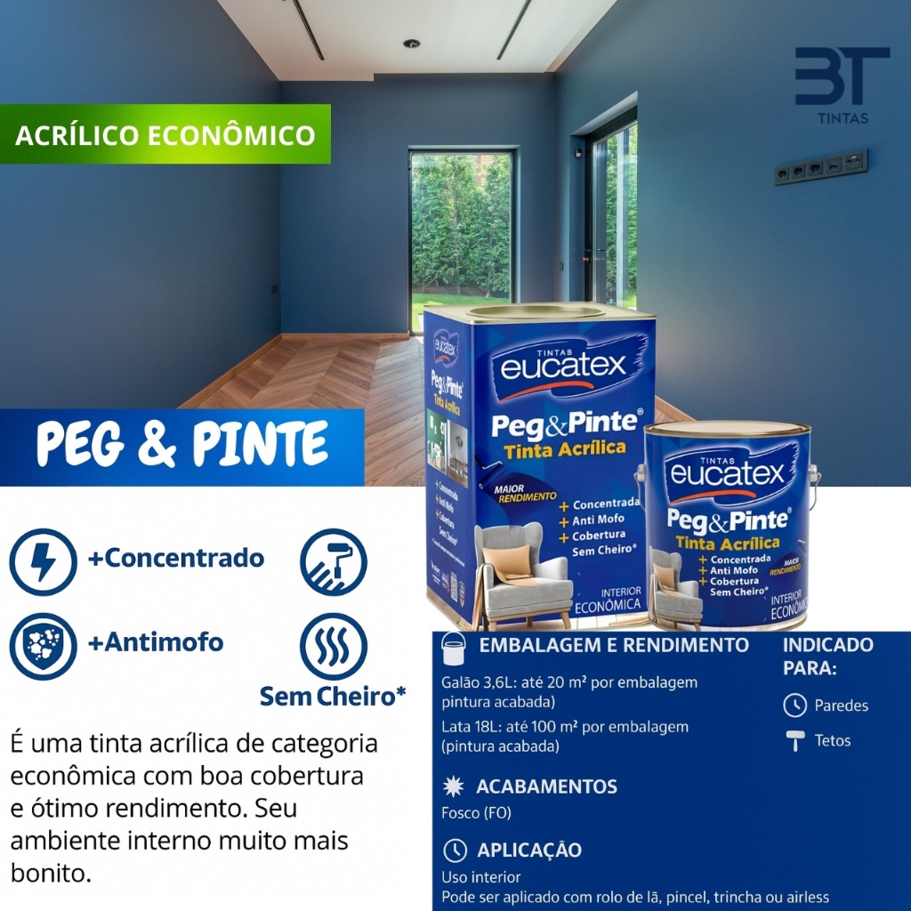 🏡 Eucatex Peg & Pinte 3,6L Branco Neve – Tinta Acrílica Econômica para Paredes e Tetos Transforme sua casa com a Tinta Acrílica Eucatex Peg & Pinte Branco Neve 3,6L! 💎 Uma solução econômica, de alta cobertura e fácil aplicação, ideal para quem busca qualidade e praticidade na hora de renovar ambientes internos. ✨ Benefícios: Cor Branco Neve: deixa o ambiente mais claro, elegante e sofisticado; Ótimo rendimento e cobertura uniforme, reduzindo o número de demãos; Secagem rápida, permitindo maior agilidade na pintura; Produto econômico sem abrir mão da qualidade; Fácil de aplicar, ideal para paredes e tetos internos. 🎯 Indicação de uso: Perfeito para paredes e tetos de ambientes internos como quartos, salas, cozinhas e escritórios, proporcionando um acabamento fosco, uniforme e duradouro.