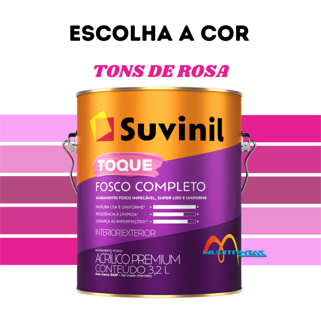 TONS DE ROSA!Se você quiser outro tom de rosa que não está no anúncio ou tamanho da tinta diferente, nos mande uma mensagem!**Suvinil Toque Fosco Completo disfarça as imperfeições na parede e te entrega um acabamento com qualidade superior. Ela tem uma cobertura impecável, com acabamento fosco. A tinta é resistente e pode ser feita em todas as cores do catálogo Suvinil para você se apaixonar pela sua casa. Essa é a tinta completona da Suvinil, a melhor tinta do mercado! Seu alto poder de cobertura permite que você renove a casa de um jeito rápido e prático com menos demãos. E mais, sem sujeira após a aplicação graças a tecnologia antirrespingo. Ela também é lavável, sem cheiro em até 4 horas após a aplicação, com longa durabilidade e seu acabamento fosco não revela imperfeições.-Secagem:Ao toque: 2 horasEntre demãos: 4 horasFinal: 12 horas-Rendimento acabado:Até 27m²-Quantidade necessária de demãos:2 a 3-Diluição:Primeira pintura sobre massa corrida, acrílica, drywall e gesso: dilua com 20% de água potável. Repintura, concreto, blocos de concreto, fibrocimento, texturas e reboco: diluir com 20% de água potável. Para aplicação com airless dilua com 20% de água potável por litro e aplique com pressão entre 1200 e 1400 psi. Use bico com abertura de 0,017” e a velocidade de aplicação entre 9 e 11 m2/min*OBSA cor exibida em sua tela é apenas uma referencia da cor real do produto. A cor real pode sofrer variação de tonalidade com relação a sua tela de exibição por se tratar de reprodução em meio virtual.
