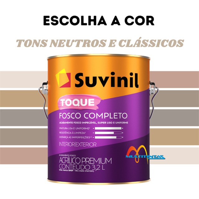 TONS NEUTROS E CLÁSSICOS!Se você quiser outro tom que não está no anúncio ou tamanho da tinta diferente, nos mande uma mensagem!**Suvinil Toque Fosco Completo disfarça as imperfeições na parede e te entrega um acabamento com qualidade superior. Ela tem uma cobertura impecável, com acabamento fosco. A tinta é resistente e pode ser feita em todas as cores do catálogo Suvinil para você se apaixonar pela sua casa. Essa é a tinta completona da Suvinil, a melhor tinta do mercado! Seu alto poder de cobertura permite que você renove a casa de um jeito rápido e prático com menos demãos. E mais, sem sujeira após a aplicação graças a tecnologia antirrespingo. Ela também é lavável, sem cheiro em até 4 horas após a aplicação, com longa durabilidade e seu acabamento fosco não revela imperfeições.-Secagem:Ao toque: 2 horasEntre demãos: 4 horasFinal: 12 horas-Rendimento acabado:Até 27m²-Quantidade necessária de demãos:2 a 3-Diluição:Primeira pintura sobre massa corrida, acrílica, drywall e gesso: dilua com 20% de água potável. Repintura, concreto, blocos de concreto, fibrocimento, texturas e reboco: diluir com 20% de água potável. Para aplicação com airless dilua com 20% de água potável por litro e aplique com pressão entre 1200 e 1400 psi. Use bico com abertura de 0,017” e a velocidade de aplicação entre 9 e 11 m2/min*OBSA cor exibida em sua tela é apenas uma referencia da cor real do produto. A cor real pode sofrer variação de tonalidade com relação a sua tela de exibição por se tratar de reprodução em meio virtual.
