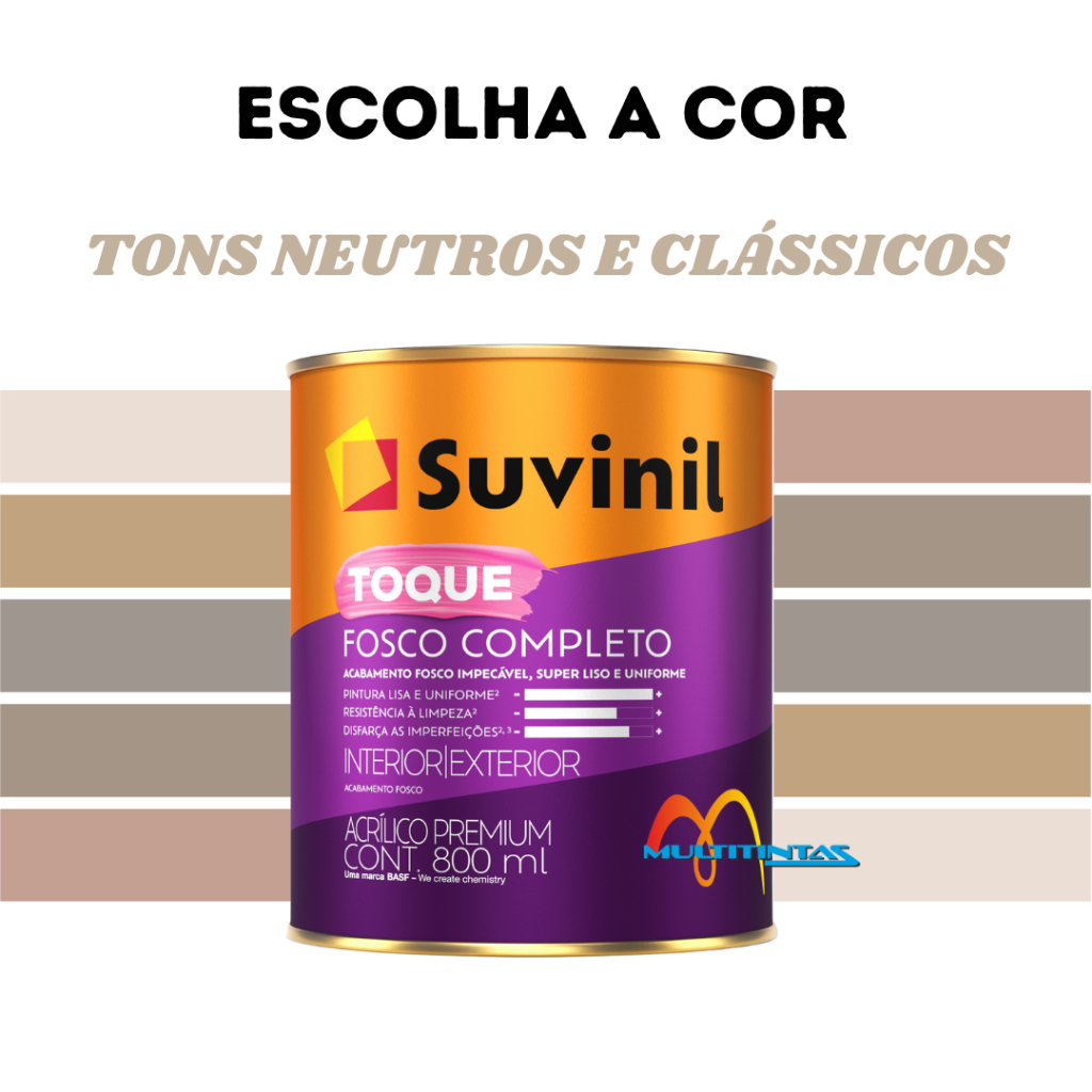 TONS CLÁSSICOS E NEUTROS!Se você quiser outro tom que não está no anúncio ou tamanho da tinta diferente, nos mande uma mensagem!Suvinil Toque Fosco Completo disfarça as imperfeições na parede e te entrega um acabamento com qualidade superior. Ela tem uma cobertura impecável, com acabamento fosco. A tinta é resistente e pode ser feita em todas as cores do catálogo Suvinil para você se apaixonar pela sua casa. Essa é a tinta completona da Suvinil, a melhor tinta do mercado! Seu alto poder de cobertura permite que você renove a casa de um jeito rápido e prático com menos demãos. E mais, sem sujeira após a aplicação graças a tecnologia antirrespingo. Ela também é lavável, sem cheiro em até 4 horas após a aplicação, com longa durabilidade e seu acabamento fosco não revela imperfeições.-Secagem:Ao toque: 2 horasEntre demãos: 4 horasFinal: 12 horas-Rendimento acabado:Até 5,5m²-Quantidade necessária de demãos:2 a 3-Diluição:Primeira pintura sobre massa corrida, acrílica, drywall e gesso: dilua com 20% de água potável. Repintura, concreto, blocos de concreto, fibrocimento, texturas e reboco: diluir com 20% de água potável. Para aplicação com airless dilua com 20% de água potável por litro e aplique com pressão entre 1200 e 1400 psi. Use bico com abertura de 0,017” e a velocidade de aplicação entre 9 e 11 m2/min*OBSA cor exibida em sua tela é apenas uma referencia da cor real do produto. A cor real pode sofrer variação de tonalidade com relação a sua tela de exibição por se tratar de reprodução em meio virtual.