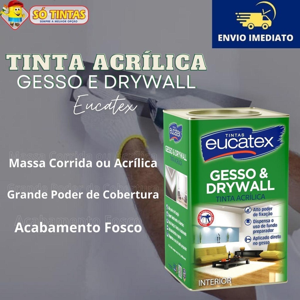 Tinta Acrílica Gesso e Drywall Branco Fosco 18 Litros – Eucatex A Tinta Acrílica Eucatex Gesso & Drywall 18L é a escolha ideal para quem busca acabamento profissional, secagem rápida e alta aderência em superfícies de gesso e drywall. Desenvolvida especialmente para aplicação direta sobre o gesso, dispensa fundo preparador, penetra profundamente na superfície e forma um filme uniforme que evita descascamentos, garantindo cobertura superior e durabilidade excepcional. Especificações Técnicas Produto: Tinta Acrílica Eucatex Gesso & Drywall Volume: 18 Litros Uso: Interno Superfícies indicadas: Gesso corrido, placas de gesso, drywall, sancas e áreas de acabamento interno Cor: Branco Acabamento: Fosco uniforme Características: • Alta aderência e penetração profunda • Baixo respingamento e fácil aplicação • Ação aglutinante de partículas – evita descascamentos • Secagem rápida e excelente cobertura • Alta durabilidade e rendimento Diluição: Rolo, trincha e pincel: até 40% de água limpa Airless: até 50% de água limpa (pressão entre 1200 e 1400 psi) Rendimento: até 100 m² por embalagem / pintura finalizada Demãos: 2 a 3, com intervalo de 4 horas Secagem: Ao toque: 1 hora Entre demãos: 4 horas Final: 12 horas Aplicação: rolo de lã de pelo baixo, pincel, trincha ou airless Por que escolher a Tinta Gesso & Drywall Eucatex ✔ Aplicação direta, sem necessidade de fundo ✔ Excelente cobertura e rendimento ✔ Evita descascamentos e manchas ✔ Acabamento fosco sofisticado ✔ Secagem rápida e baixo odor ✔ Ideal para ambientes internos e sancas Dicas de Aplicação 1️⃣ Certifique-se de que a superfície esteja firme, limpa, seca e sem pó. 2️⃣ Misture bem a tinta antes do uso e faça a diluição correta conforme o tipo de aplicação. 3️⃣ Aplique de 2 a 3 demãos cruzadas, respeitando o intervalo entre demãos. 4️⃣ Evite pintar em dias muito úmidos ou chuvosos. 5️⃣ Limpe ferramentas com água e sabão logo após o uso. Perguntas Frequentes Acompanha nota fiscal? ✔ Sim, todos os produtos são enviados com nota fiscal. Posso comprar mais de uma unidade no mesmo pedido? 🚚 Para embalagens de 18L, é permitido apenas 1 unidade por pedido, devido às restrições de transporte. Como é feito o envio? ✔ O envio é realizado pela transportadora da Shopee, garantindo segurança e agilidade na entrega. 👉 Garanta agora sua Tinta Acrílica Gesso & Drywall Eucatex 18L e conquiste paredes impecáveis, acabamento fosco elegante e durabilidade incomparável — ideal para quem busca qualidade e praticidade no mesmo produto. 🏆 Só Tintas, sempre a melhor opção! Somos a maior rede de lojas de tintas do estado do Rio de Janeiro. Desde 1977, oferecemos os melhores produtos e soluções em pintura imobiliária, automotiva e industrial. São mais de 30 lojas físicas, sempre com atendimento de excelência e transparência. Nossa missão é simples: levar cor para a vida das pessoas!