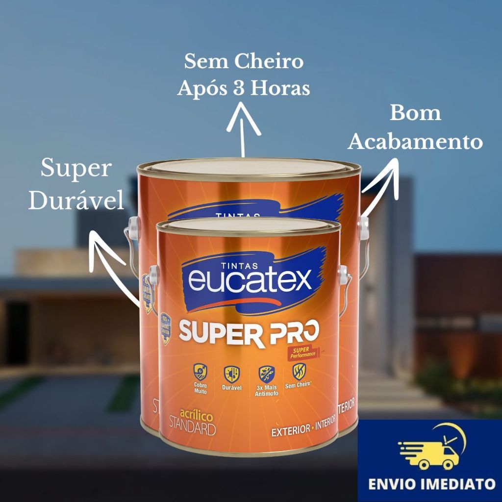 O que é a Tinta Acrílica Eucatex Super Pró Fosco A Tinta Acrílica Eucatex Super Pró Fosco 3,6L é a solução perfeita para quem deseja alta performance, excelente cobertura e resistência em projetos internos e externos. Sua fórmula avançada oferece acabamento fosco uniforme, 3x mais proteção contra mofo e não deixa cheiro após 3 horas da aplicação. É indicada para superfícies de alvenaria, massa acrílica e corrida, fibrocimento, reboco, concreto e repinturas. Especificações Técnicas Produto: Tinta Acrílica Super Pró Fosco Marca: Eucatex Volume: 3,6 Litros Acabamento: Fosco Superfícies indicadas: Alvenaria, reboco, massa acrílica e corrida, fibrocimento, concreto e repinturas Rendimento: Até 22 m² por embalagem (acabamento final) Diluição: Até 20% de água limpa em todas as demãos Secagem: Ao toque: 1h | Entre demãos: 4h | Final: 12h Demãos recomendadas: 2 a 3 demãos Validade: 36 meses após a fabricação Aplicação: Rolo de lã de pelo baixo, pincel, trincha ou pistola (airless) Por que escolher a Eucatex Super Pró Fosco ✔ Excelente cobertura e rendimento ✔ Alta resistência e durabilidade ✔ 3x mais proteção contra mofo ✔ Acabamento fosco moderno e uniforme ✔ Sem cheiro após 3 horas da aplicação ✔ Marca Eucatex, referência em qualidade no mercado Onde usar • Casas e apartamentos • Prédios e fachadas • Áreas internas e externas • Paredes de reboco, massa acrílica e corrida • Concreto, blocos de concreto e fibrocimento • Superfícies já pintadas (repintura) Dicas de aplicação Certifique-se de que a superfície esteja firme, limpa, seca e sem poeira, mofo ou gordura. Em rebocos novos, aguarde a cura de 30 dias antes da pintura. Utilize Fundo Preparador Eucatex em superfícies fracas ou caiadas. Aplique 2 a 3 demãos respeitando o intervalo de 4 horas entre elas. Perguntas Frequentes Acompanha nota fiscal? ✔ Sim, todos os produtos são enviados com nota fiscal. Posso comprar mais de 1 unidade no mesmo pedido? 🚚 Para embalagens de 3,6L, é permitido comprar até 4 unidades por pedido. Para adquirir mais, é necessário realizar novos pedidos. Como é feito o envio? ✔ O envio é realizado pela transportadora da Shopee, garantindo segurança e agilidade na entrega. 👉 Garanta já a sua Tinta Acrílica Eucatex Super Pró Fosco 3,6L e conquiste mais cobertura, durabilidade e proteção contra mofo em seus projetos internos e externos.