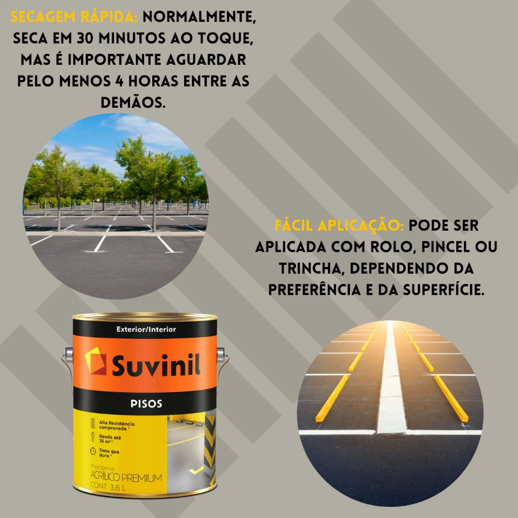 CONHEÇA A SUVINIL PISOS! Se você procura por uma tinta para piso de alta performance, a Suvinil Pisos é uma excelente alternativa! Indicado para ambientes internos e externos, o produto é antiderrapante e conta com diversos atributos exclusivos. Veja! COMPOSIÇÃO A Suvinil Pisos é uma tinta acrílica premium com acabamento fosco disponível em oito cores, incluindo os clássicos Branco Neve e Cinza Escuro Pisos. Oferecendo alta cobertura e resistência, o produto é capaz de resistir ao atrito de circulação de pessoas e carros, possuindo tecnologia inovadora de alta durabilidade. INDICAÇÃO De fácil aplicação, a tinta acrílica para pisos é indicada para superfícies de concreto (rústico ou liso), cimento e cerâmica. É possível usá-la para pintura e/ou repintura de pisos nas áreas de lazer, varanda, quadra, garagem, calçada e até escada. DILUIÇÃO Encontrada em embalagens de 3,6 e 18 litros, a nossa tinta para piso deve ser diluída antes da aplicação. Graças à fórmula, é possível diluí-la com 20% de água potável em todas as demãos, seguindo as instruções presentes na embalagem. COMO APLICAR A SUVINIL PISOS? Se você pretende apostar na Suvinil Pisos para pintar os pisos da sua casa, o primeiro passo é verificar o estado da área que receberá a pintura. É importante garantir que esse espaço esteja livre de patologias, como mofo e infiltrações. Feito isso, proteja o ambiente, coloque os EPIs e lixe toda superfície, de modo que fique bem uniforme. Depois, retire o pó. Caso seja necessário, aplique um fundo preparador na área. Espere curar e secar. Após a preparação, misture e dilua a tinta para piso para começar o processo de pintura. Aplique o produto com um rolo de lã ou um pincel, cobrindo igualmente todo o espaço desejado — lembrando que a solução rende até 130 m² acabados. DEMÃOS E TEMPO DE SECAGEM A nossa tinta de piso requer de 2 a 3 demãos para garantir o acabamento e a cor ideal. O tempo de secagem é de 2 horas ao toque, 4 horas entre as demãos e 72 horas finais. Dica: deixe o ambiente ventilado para ajudar no processo de secagem. ACABAMENTO: •Fosco SECAGEM: •Ao toque: 2 horas •Entre demãos: 4 horas •Final: 72 horas RENDIMENTO ACABADO: •3,6L: Rendimento até 14 m² QUANTIDADE NECESSÁRIA DE DEMÃOS: •2 a 3 DILUIÇÃO: •Pintura sobre cimento* novo queimado, repintura, cimento* novo não queimado, fibrocimento e concreto: dilua com 20% de água potável em todas as demãos. DIMENSÕES: •3,6L: 17 cm x 18,5 cm x 17 cm PESO BRUTO: •3,6L: 4.800 kg PESO LÍQUIDO: •3,6L: 4.568 kg TINTA PISO SUVINIL AMARELO DEMARCAÇÃO 3,6L
