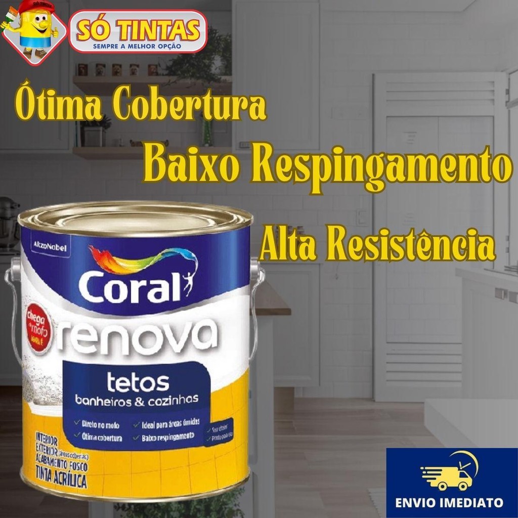 Imagine suas paredes perfeitamente pintadas, livres de mofo e com um acabamento impecável. Renova Tetos não só revitaliza seu ambiente, mas também garante um ar fresco e saudável, tornando seus espaços mais acolhedores. Com uma aplicação fácil e rápida, você terá um resultado surpreendente que impressionará a todos. A Renova Tetos, Banheiros & Cozinhas Branca Coral é a solução definitiva: •Fácil Aplicação: Aplique diretamente sobre o mofo, economizando tempo e esforço. Não precisa de limpeza prévia! •Cobertura Superior: Com excelente poder de cobertura, você alcançará um acabamento perfeito com apenas 2 a 3 demãos. •Secagem Rápida: Seca ao toque em apenas 30 minutos, permitindo que você retome a sua rotina rapidamente. •Acabamento Fosco: Um visual sofisticado que disfarça imperfeições e facilita retoques. •Resistência ao Mofo: Mantém suas paredes livres de mofo por muito mais tempo, garantindo um ambiente saudável. •Baixo Respingo: Menos sujeira e mais controle durante a aplicação, tornando a experiência muito mais agradável. Dados Técnicos 1. Descrição do Produto: •Tipo: Tinta Acrílica •Aplicação: Interna e externa coberta •Acabamento: Fosco 2. Composição: •Base: Acrílica •Solvente: Água 3. Propriedades: •Cobertura: Ótima •Aderência: Alta •Resistência: Boa •Secagem: Rápida •Odor: Inodoro após 4 horas 4. Rendimento: •Até 18 m² por embalagem de 3,6 Litros 5. Tempo de Secagem: •Ao toque: 30 minutos •Entre demãos: 4 horas •Final: 4 horas Aplicação Passo a Passo: 1.Preparação da Área: oCubra o chão e móveis com lona ou papelão. oRemova quadros, prateleiras e outros objetos das paredes. 2.Preparação da Superfície: oSe houver mofo: Use a espátula para remover camadas excessivas. Limpe a área com pano úmido e aguarde secar. oParedes em bom estado: Lixe levemente e limpe o pó com pano úmido. oSuperfícies novas ou com imperfeições: Aplique Massa Corrida para corrigir e lixe após secar. 3.Tratamento de Superfícies Especiais: oGesso ou concreto: Aplique o Fundo Preparador de Paredes da Coral, exceto em gesso corrido (use Renova Gesso & Drywall). oCom reboco novo: Aguarde 30 dias, lixe e aplique o Selador Acrílico da Coral. 4.Mistura da Tinta: oAbra a embalagem e misture bem a tinta com uma espátula de plástico, metal ou madeira. 5.Aplicação da Tinta: oUse o rolo para cobrir grandes áreas. Para cantos e bordas, use o pincel ou trincha. oAplique a primeira demão de forma uniforme, evitando respingos. 6.Secagem: oAguarde 30 minutos para a secagem ao toque. oEntre demãos, aguarde 4 horas. 7.Demãos Adicionais: oAplique de 2 a 3 demãos, conforme necessário, para uma cobertura ideal. 8.Finalização: oApós a última demão, aguarde 4 horas para a secagem completa antes de recolocar objetos na parede. Principais perguntas: Acompanha nota fiscal? Sim, todos os nossos produtos são enviados com nota fiscal. O envio é por Correios? Pode ser enviado por Correios ou por transportadora privada, isso vai depender da disponibilidade das transportadoras que atendem o seu endereço. Porque não posso comprar mais de 4 unidades no mesmo pedido? Infelizmente há uma limitação por parte das transportadoras. Elas enviam apenas 4 unidades em cada pedido devido às dimensões e peso do pacote. Para mais unidades, você vai precisar fazer mais de um pedido, respeitando o limite máximo de 4 por pedido. Só Tintas, sempre a melhor opção. Somos a maior rede de lojas de tintas no estado do Rio de Janeiro. Desde 1977, a Só Tintas atua no Rio de Janeiro oferecendo os melhores produtos e soluções em pintura imobiliária, automotiva e industrial. Somos uma empresa familiar que começou em Teresópolis e hoje temos mais de 30 lojas físicas. Trabalhamos de forma ética e transparente, com o principal objetivo de proporcionar aos nossos clientes um atendimento de excelência, provendo as melhores soluções. Nossa missão é levar cor para a vida das pessoas. Por isso a Só Tintas é Sempre a Melhor Opção