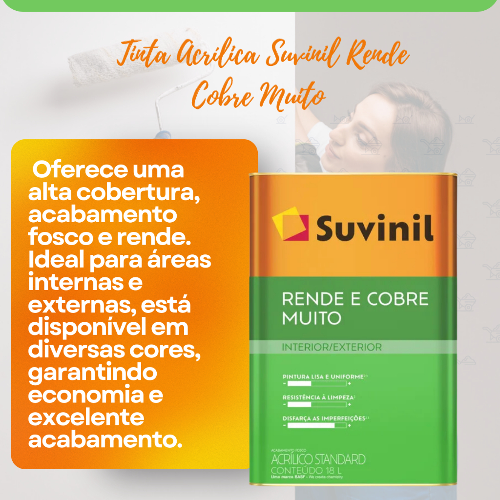 Tinta Acrílica Suvinil Rende e Cobre Muito Cores 18 Litros --------------------------------------------------------------------------------------------------------------------------- #Hipertintas #suvinil #Toquefoscocompleto A Tinta Acrílica Suvinil Rende e Cobre Muito é uma opção prática e econômica, ideal para quem busca boa cobertura e rendimento em pinturas de ambientes internos e externos. ------------------------------------------------------------------------------------------------------------------------------ Características ✔ Tipo: Tinta acrílica à base de água. ✔ Uso: Indicada para paredes internas e externas. ✔ Acabamento: Fosco ✔ Variedade de cores: Disponível em diversas cores para combinar com diferentes estilos de decoração. ✔ Alta cobertura: Excelente desempenho em poucas demãos. SOBRE NÓS --------------------------------------------------------------------------- Hipertintas é uma empresa familiar com profissionais qualificados e competentes, que com dedicação proporciona à seus clientes um atendimento personalizado. Fundada há 44 anos, somos especialistas na venda de tintas e artigos para pintura. Na Hipertintas, você PODE CONFIAR! #SuvinilRendeCobreMuito#TintaAcrílica#PinturaPerfeita#FaçaVocêMesmo#ParedesColoridas#DecoraçãoEficiente#RenoveSuaCasa#AltaCobertura#PinturaInterna#PinturaExterna