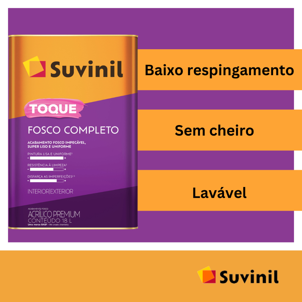 Tinta Acrílica Suvinil Toque Fosco Completo 18L / 16L - Cores ------------------------------------------------------------------------------------------------------------------------------------------------------------------------------------------------------- #Suvinil #Tintafosca #internos/externos. A tinta Suvinil Toque Fosco Completo de 18 litros é uma tinta acrílica premium à base de água, ideal para quem busca um acabamento fosco impecável, superliso e uniforme em ambientes internos e externos. ------------------------------------------------------------------------------------------------------------------------------------------------------------------------------------------------------- Benefícios - Baixo respingamento, lavável e sem cheiro, permitindo que você retome sua rotina rapidamente após a pintura. - Secagem Ao toque em 2 horas, entre demãos em 4 horas e secagem final em 12 horas. - Indicada para paredes, tetos e gesso em ambientes como quartos, salas, escritórios, corredores, fachadas, quintais, churrasqueiras e varandas. ------------------------------------------------------------------------------------------- SOBRE NÓS ------------------------------------------------------------------------------------------- Hipertintas é uma empresa familiar com profissionais qualificados e competentes, que com dedicação proporciona à seus clientes um atendimento personalizado. Fundada há 44 anos, somos especialistas na venda de tintas e artigos para pintura. Na Hipertintas, você PODE CONFIAR! #Suvinil#ToqueFoscoCompleto#PinturaPerfeita#DecoraçãoDeInteriores#TintaAcrílica#AcabamentoFosco#ReformaDeCasa#Decoração#CoresQueInspiram