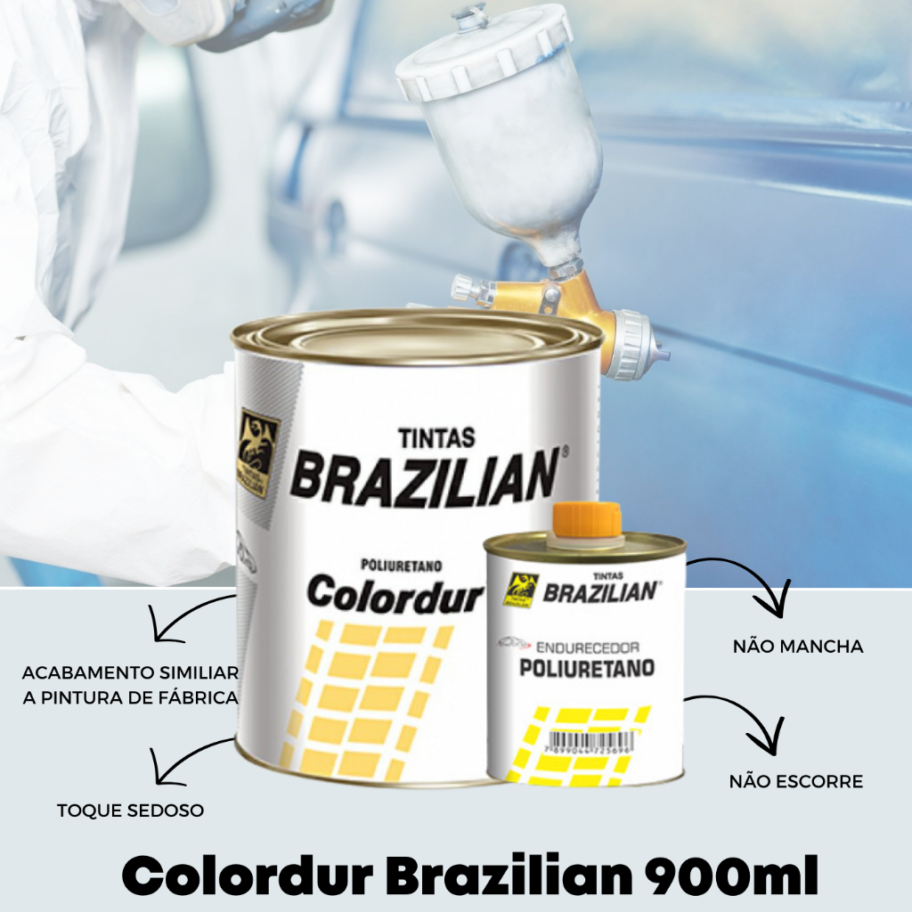 COLORDUR – ESMALTE POLIURETANO BRAZILIAN 900MLTINTA PU 675ML + CATALIZADOR 225ML = 900ML====================================== INFORMAÇÕES SOBRE O PRODUTO======================================Colordur – Esmalte Poliuretano é um esmalte poliuretano acrílico de alta durabilidade, excelente resistência ao intemperismo, ótima retenção de cor e brilho. Indicado para pintura geral, parcial ou retoque de veículos.======================================Atributos:======================================•Alto rendimento, Excelente resistência ao intemperismo, ótima retenção de cor e brilho.Ambiente: Exterior •3 partes (vol.) de tinta para 1 parte (vol.) de catalisador cód. 0.004.83 •Adicionar 10 a 20% de Diluente para PU cód. 0.001.83 sobre a mistura. Consumir em 3 horasAplicação:Pintura geral ou parcial de veículos automotivos.Testar a cor antes de aplicar sobre o veículo.Regular a pressão do ar entre 40-50 lbs/Pol², aplicar de 2 a 3 demãos com intervalo de 5 a 10 minutos.======================LOJA======================- O grupo Soluwan possui loja física e online a mais de 29 anos satisfazendo nossos clientes.- Vendemos somente produtos novos e de qualidade garantida.- Despachamos em 24 horas- Entregamos para todo o BRASIL.#Colordur #BRAZILIAN #Automotivo #Massarapida #POLIURETANO #Tintaautomotiva #EsmaltePOLIURETANO #Pinturaautomotiva #Colordurbrazilian #Tintacolordur #Repinturaautomotiva #Tintasbrazilian