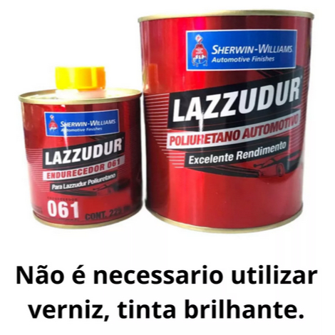 Descrição do Produto: Indicado para pintura geral, parcial e retoques de veículos automotivos, transportes e outros. Fácil de usar e aplicar.Possui secagem rápida, alta resistência à intempéries naturais e agentes químicos. O uso deste produto é exclusivo a profissionais devidamente treinados. Catálise e Diluição: 3 Partes em volume de Lazzudur PU 1 Parte em Volume de Endurecedor 061 Marca:Lazzuril Quantidade: 675ml de Tinta + 225ml de catalisador
