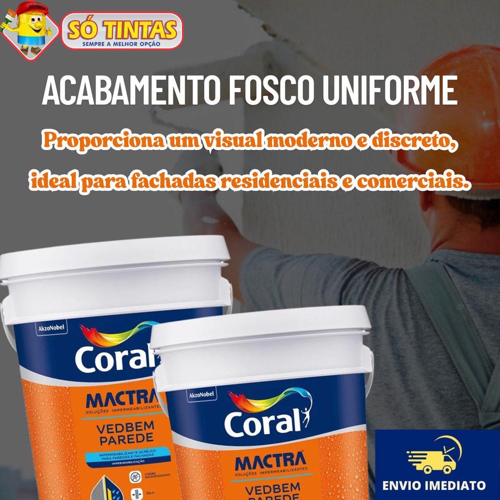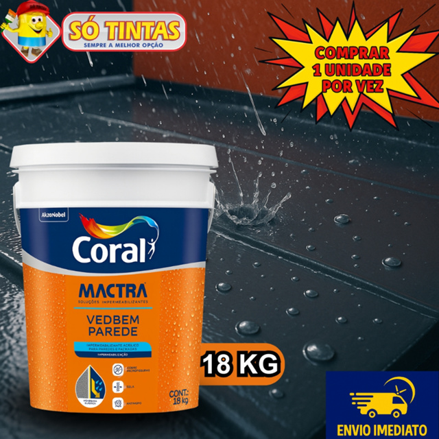 Borracha Líquida Impermeabilizante Coral Mactra Vedbem Parede 18 kg – Proteção Total Contra Infiltrações A Borracha Líquida Impermeabilizante Coral Mactra Vedbem Parede 18 kg é a solução definitiva contra infiltrações, umidade e desgaste em superfícies externas. Com tecnologia acrílica de alto desempenho e elasticidade avançada, forma uma membrana impermeável que protege e embeleza fachadas, paredes e telhados, prevenindo trincas, bolhas e manchas causadas pela ação do tempo. Perfeita para paredes externas, lajes, fachadas e telhas de fibrocimento ou concreto, a Vedbem Parede combina impermeabilização total, acabamento uniforme e durabilidade imbatível, garantindo proteção e estética de alto padrão por muitos anos. Especificações Técnicas Produto: Borracha Líquida Impermeabilizante Coral Mactra Vedbem Parede Tipo: Membrana impermeável elastomérica acrílica Uso: Externo – fachadas, paredes, lajes e telhados Acabamento: Fosco uniforme Elasticidade: Alta – acompanha microfissuras e movimentações da superfície Diluição: 1ª demão: até 10% de água limpa Demais demãos: pronto para uso Demãos: 2 a 3 (cruzadas: horizontal e vertical) Intervalo entre demãos: 6 horas Secagem: Ao toque: 1 a 2 horas Final: 24 a 72 horas (dependendo das condições climáticas) Rendimento médio: até 40 m²/final (18 kg) Aplicação: Pincel, rolo de lã ou sistema airless Resistência à chuva: Após 24 horas de cura Por que escolher Vedbem Parede ✔ Impermeabilização total e duradoura ✔ Elasticidade superior – acompanha microfissuras ✔ Reduz retrabalho e manutenção ✔ Resistente à chuva, sol e umidade intensa ✔ Acabamento fosco uniforme e estético ✔ Secagem rápida e fácil aplicação ✔ Produto base água, ecológico e de baixo odor Onde usar ✅ Fachadas externas ✅ Lajes expostas e marquises ✅ Paredes externas sujeitas à chuva e infiltração ✅ Telhas de fibrocimento, cimento ou concreto ✅ Bases de alvenaria com fissuras e microtrincas Dicas de Aplicação 1️⃣ Certifique-se de que a superfície esteja firme, limpa, seca e sem mofo, graxa ou poeira. 2️⃣ Em superfícies antigas, lave bem e aplique Matamofo Mactra, se necessário. 3️⃣ Aplique duas a três demãos cruzadas (horizontal e vertical) com rolo, pincel ou airless. 4️⃣ Respeite o intervalo mínimo de 6 horas entre demãos. 5️⃣ Evite aplicar em dias chuvosos, frios (abaixo de 10 °C) ou muito quentes (acima de 40 °C). 6️⃣ Aguarde 24 horas de cura antes de expor à chuva. Perguntas Frequentes Acompanha nota fiscal? ✔ Sim, todos os produtos são enviados com nota fiscal. Posso comprar mais de uma unidade no mesmo pedido? 🚚 Para embalagens de 18 kg, é permitido comprar apenas 1 unidade por pedido, devido às limitações de transporte. Para adquirir mais unidades, é necessário realizar novos pedidos. Como é feito o envio? ✔ O envio é realizado pela transportadora da Shopee, garantindo segurança e agilidade na entrega. 👉 Garanta já sua Borracha Líquida Impermeabilizante Coral Mactra Vedbem Parede 18 kg e conquiste fachadas, paredes e telhados totalmente protegidos contra infiltrações, com elasticidade, durabilidade e acabamento premium Coral Mactra. 🏆 Só Tintas, sempre a melhor opção! Somos a maior rede de lojas de tintas do estado do Rio de Janeiro. Desde 1977, oferecemos os melhores produtos e soluções em pintura imobiliária, automotiva e industrial. São mais de 30 lojas físicas, sempre com atendimento de excelência e transparência. Nossa missão é simples: levar cor para a vida das pessoas!