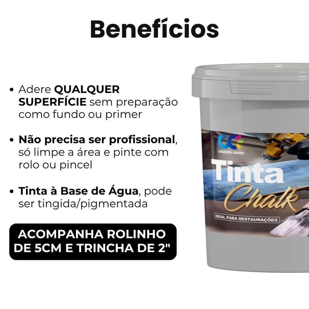Transforme qualquer ambiente com a Tinta Chalk! Ideal para quem busca renovar, restaurar e personalizar superfícies com facilidade, estilo e alta qualidade. <<<TINTA A BASE DE ÁGUA>>> CORES DISPONÍVEIS: - Amarelo Gema - Amarelo Seco - Ametista - Aquamarine - Azul Country - Azul Folk - Azul Petroleo - Bege Ginger - Branco - Cinza Cromo - Cinza Neblina - Dark Blue - Deserto - Grafite - Grão Torrado - Menta - Off White - Preto - Quartzo Verde - Rosa Balloon - Rosa Cristal - Savana - Turquesa - Verde Inverno - Verde Oliva - Vermelho Dark Leve um tom sofisticado e aconchegante para seus projetos de Home Decor! *PRINCIPAIS VANTAGENS*: - Uso Universal: Pode ser aplicada em parede, alvenaria, gesso, drywall, madeira, cerâmica, metal, galvanizado, vidro, acrílico, plástico e PET – perfeição em qualquer superfície! - Alta Cobertura e Tecnologia Avançada: Desenvolvida especialmente para restauração e decoração. Cobre muito com menos produto! - Fácil de Aplicar: Não precisa de primer ou produto preparatório – pinte direto, sem complicação! - Acabamento Matte Extra Fosco: Sofisticação garantida e visual moderno para móveis e paredes. - Secagem Rápida: Toque seco em 30 a 40 minutos por demão. Cura total em até 5 dias, proporcionando agilidade ao seu projeto. - Rendimento Imbatível: Cada balde de 1,6kg rende até 15m² (pode variar conforme a superfície). *VOLUME*: 1,6KG **PERGUNTAS FREQUENTES** 1 - O QUE É A TINTA CHALK? A tinta Chalk é uma tinta decorativa moderna, famosa por seu acabamento ultra fosco (mate), toque suave e efeito vintage ou retrô. Ela se destaca no mundo da decoração principalmente pela sua incrível ADERÊNCIA UNIVERSALl: pode ser aplicada diretamente em praticamente qualquer superfície – madeira, metal, vidro, cerâmica, plástico, parede, MDF, entre outros – sem a necessidade de lixar ou usar primer. Prática, versátil e de alta cobertura, a tinta Chalk é muito utilizada para transformar, restaurar e personalizar móveis, objetos e ambientes de forma fácil, rápida e criativa. 2 - PRECISO USAR FUNDO OU PRIMER ANTES DE APLICAR A TINTA CHALK? Não precisa! Uma das maiores vantagens da tinta Chalk é sua excelente aderência. Ela foi desenvolvida para ser aplicada diretamente sobre a maioria das superfícies — madeira, vasos, paredes, cerâmica, vidro, metal, plástico, MDF, gesso e muito mais — sem necessidade de fundo, selador ou primer. Isso significa mais praticidade, economia e ganho de tempo na hora de renovar seus móveis, objetos e ambientes! 3 COMO A SUPERFÍCIE PRECISA ESTAR PREPARADA PARA RECEBER A TINTA CHALK? A tinta Chalk é famosa justamente por não exigir primer, fundo nem lixamento pesado antes da aplicação! Porém, para garantir os melhores resultados, basta seguir alguns cuidados simples: Limpeza: Garanta que a superfície esteja limpa, seca e livre de poeira, gordura, óleo ou resíduos. Superfícies brilhantes ou com cera: Recomenda-se apenas um leve lixamento para retirar o brilho ou a camada de cera, facilitando ainda mais a aderência. Rachaduras ou imperfeições: Corrija irregularidades ou buracos antes de pintar, se desejar um acabamento perfeito. Poeira e umidade: Evite aplicar se a superfície estiver úmida ou empoeirada. Pronto! Agora é só aplicar a tinta Chalk e transformar seu projeto. 4 - PRECISO SER PROFISSIONAL PARA APLICAR A TINTA CHALK? Não! Você não precisa ser profissional para usar a tinta Chalk. Ela é conhecida justamente pela facilidade de aplicação, sendo perfeita tanto para quem faz projetos DIY (faça você mesmo) quanto para profissionais de decoração e restauração. A aplicação é simples, prática e não exige técnicas avançadas: Misture bem a tinta; Aplique com rolo, pincel ou trincha. Com a Tinta Chalk, qualquer pessoa pode transformar móveis, objetos ou qualquer superfície, mesmo sem experiência. Você vai se surpreender com o resultado! *Dica Importante: Evite a aplicação em dias chuvosos para garantir o melhor resultado!