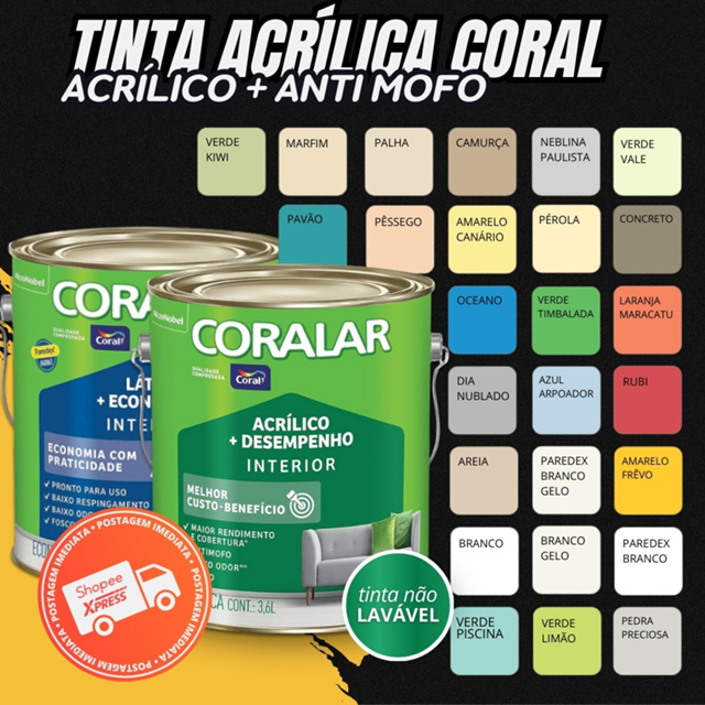 | Tinta Coralar Anti Mofo Acrilica Parede 3,6 Litros Escolha A Cor In... este produto | R$ 59,90 | 43% | 4.9/5 | 59 |