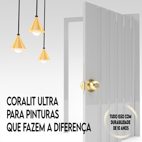 Coralit Ultra Resistência - Acetinado Coralit Ultra Resistência é um esmalte sintético de alta performance que oferece MÁXIMA PROTEÇÃO e o ACABAMENTO PERFEITO na hora de proteger e embelezar portas, janelas e portões no exterior da casa. Sua fórmula com silicone cria uma película brilhante de alta proteção, que conserva o brilho e a aparência de novo por muito tempo. O resultado é um acabamento perfeito. A durabilidade de Coralit é de 10 anos. Materiais de aplicação Áreas grandes: Rolo de espuma ou pistola. Áreas pequenas: Pincel com cerdas macias. Pistola: 35-40 lbs/pol² ou 2,5-2,8 Kgf/cm². Acabamento Acetinado RENDIMENTO Até 75 m² cada 3,6L por demão Secagem ao toque 1 a 3 horas ao toque 45 minutos entre demãos 18 horas final Número de demãos 2 Características do produto • Durabilidade de 10 anos • Máxima Proteção • Acabamento Perfeito • Ultra Resistência • Mais cobertura As cores podem sofrer variações de acordo com o tipo, configuração e resolução do seu aparelho. Considere apenas como uma referência. Para uma visualização mais precisa, consulte o catálogo do produto disponível em lojas e, sempre que possível, faça um teste no local a ser pintado utilizando uma pequena quantidade de tinta na cor escolhida.