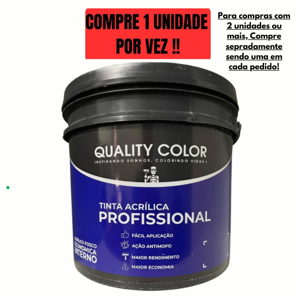 !!!!!!ATENÇÃO COMPRE APENAS UM BALDE POR PEDIDO!!!!!! !!!!!!ATENÇÃO COMPRE APENAS UM BALDE POR PEDIDO!!!!!! !!!!!!ATENÇÃO COMPRE APENAS UM BALDE POR PEDIDO!!!!!! !!!!!!ATENÇÃO COMPRE APENAS UM BALDE POR PEDIDO!!!!!! !!!!!!ATENÇÃO COMPRE APENAS UM BALDE POR PEDIDO!!!!!! !!!!!!ATENÇÃO COMPRE APENAS UM BALDE POR PEDIDO!!!!!! !!!!!!ATENÇÃO COMPRE APENAS UM BALDE POR PEDIDO!!!!!! "TINTA ACRÍLICAPROFISSIONAL FOSCO A Tinta Acrílica Profissional Fosco é um produto de excelente cobertura, baixo respingo, alta resistência à intempéries e ótimo alastramento. CORES : 38 cores atuais RENDIMENTO: Balde 20 KG Mín. 80m². acabado Galão 4 KG Mín. 16m². acabado Sendo de 2 a 3 demãos para o resultado informado acima. NORMAS TÉCNICAS: Classificado conforme ABNT NBR 11702:2019 Tipo 4.5.2 (fosco). Produto em conformidade com a ABNT NBR 15079-1 (fosco). CORES 38 cores atuais