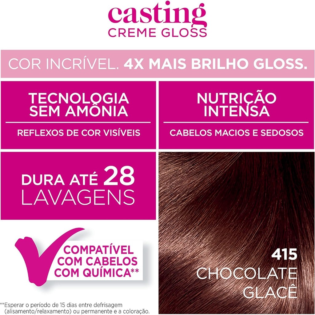 | Tinta De Cabelo Casting Creme Gloss 415 Chocolate Glacê este produto | R$ 51,99 | 24% | 5.0/5 | 9 |