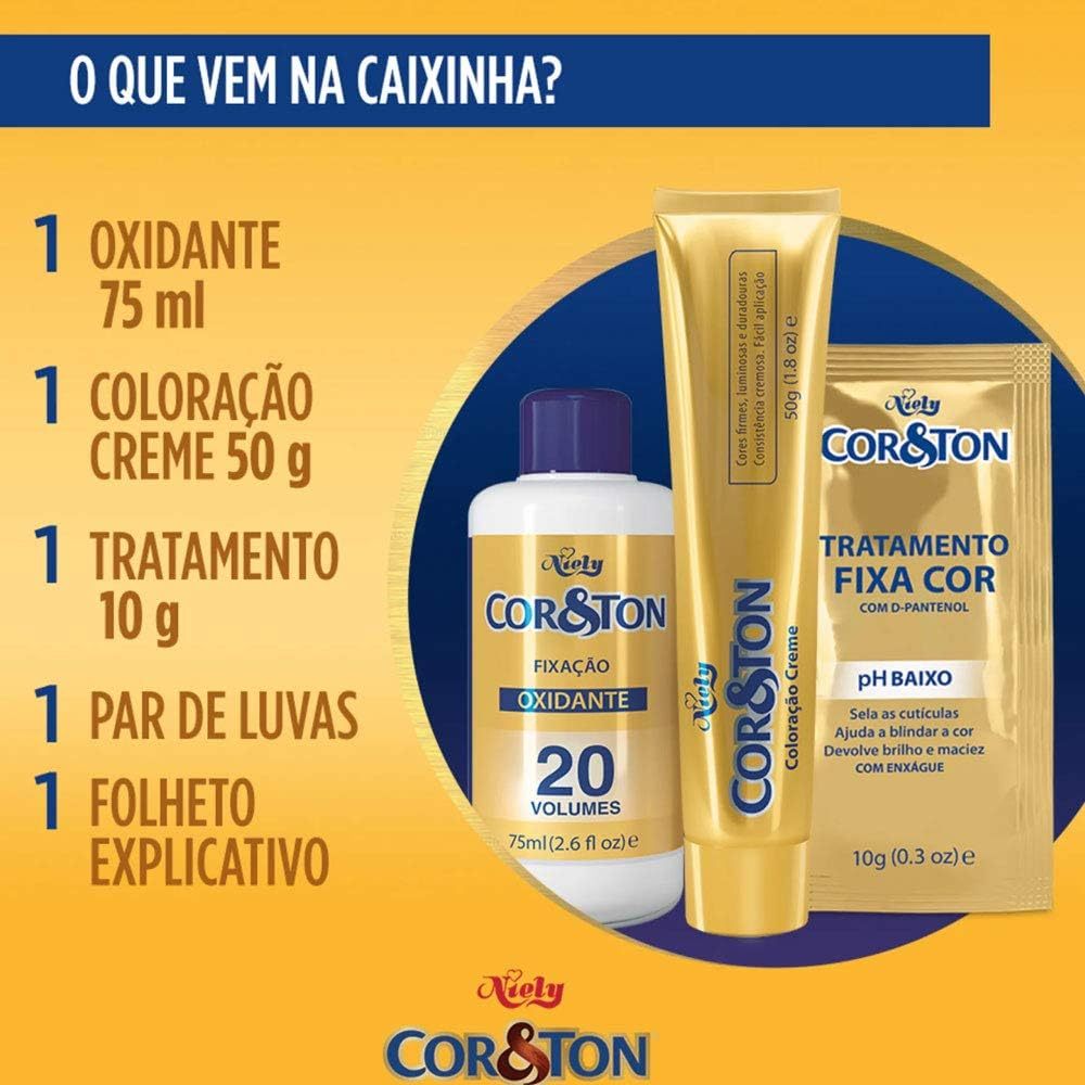 Tinta de Cabelo Cor&Ton Niely Mini Kit 7.44 Ruivo Acobreado A Cor&Ton Niely 7.44 Ruivo Acobreado é uma coloração permanente em creme que entrega cor vibrante, reflexo acobreado e cobertura total dos fios brancos. Com ativos que protegem, hidratar e dar brilho, é ideal para quem quer mudar o visual com resultado visível e duradouro. Principais Características: Tonalidade 7.44 “Ruivo Acobreado” Cor média vibrante com reflexos acobreados que iluminam, ideal para realçar peles morenas ou claras. Rica fórmula com ativos de cuidado Contém D‑Pantenol, queratina, gérmen de trigo, silicone e filtro UV para proteção contra danos, mais maciez e brilho aos fios. Textura cremosa e kit completo Permite aplicação uniforme, melhor absorção dos pigmentos e inclui sachê de tratamento “Fixacor” com pH baixo, que ajuda a selar as cutículas, prolongar a duração da cor e deixar o cabelo mais macio. Benefícios: Cor intensa, vibrante e reflexos acobreados visíveis Cobertura total dos fios brancos Fios mais hidratados, macios e com brilho Resultado duradouro com proteção contra desbotamento Kit prático para uso em casa Diferenciais do Produto: Sachê de tratamento “Fixacor” que ajuda a selar as cutículas e aumentar a durabilidade da coloração. Alto poder de cobertura dos fios brancos, mesmo com muitos fios já grisalhos. Marca tradicional no segmento de coloração, com variedade de cores e confiança dos consumidores. Fórmula com proteção UV para evitar que o sol desbote rapidamente a cor. Especificações Técnicas: Peso: 135 g (peso típico para o mini kit) Tipo: Coloração permanente em creme Formato: Kit com coloração + oxidante + sachê tratamento + luvas + folheto explicativo Instruções de Uso: Faça uma prova de toque e de mecha antes de usar. Misture o creme colorante com o oxidante fornecido até obter massa homogênea. Aplique o produto sobre cabelo seco, da raiz às pontas. Deixe agir de 35 a 40 minutos. Após o tempo indicado, enxágue bem até a água sair limpa. Utilize o sachê de tratamento “Fixacor” incluso para selar a cor e dar brilho extra. Avisos e Precauções: Uso externo. Evite contato com os olhos. Se ocorrer contato, enxágue abundantemente com água. Realizar sempre prova de toque 48 horas antes da aplicação. Não utilizar em sobrancelhas ou cílios. Mantenha fora do alcance de crianças. Conservar em local fresco e seco. Em caso de irritação ou reação alérgica, suspenda o uso e procure orientação médica. O que está incluso? 1 unidade de Tinta de Cabelo Cor&Ton Niely Mini Kit 7.44 Ruivo Acobreado ---- DÚVIDAS FREQUENTES ---- Os produtos são originais? Sim. Todos os nossos produtos são originais. Emitem nota fiscal? Sim. Emitimos nota fiscal para todos os pedidos.