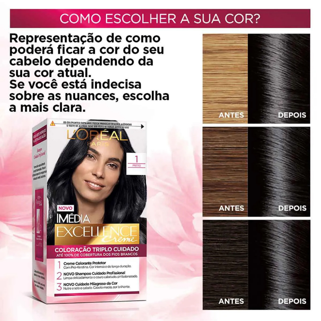 Tintura de Cabelo Imédia Excellence 1 Preto – Cor intensa com cuidado triplo para fios mais fortes e brilhantes A Tintura Imédia Excellence 1 Preto da L’Oréal Paris é ideal para quem busca uma coloração marcante, com cobertura perfeita dos fios brancos e tratamento profundo antes, durante e após a coloração. Com tecnologia de Tripla Proteção, garante resultados duradouros e fios visivelmente mais saudáveis. Principais Características: - Cor preta profunda e uniforme: Proporciona um tom intenso e brilhante com aparência sofisticada e elegante. - Tecnologia de Tripla Proteção: Protege o couro cabeludo, reforça e sela os fios, proporcionando maior durabilidade da cor. - Cobertura total dos fios brancos: Resultados homogêneos da raiz às pontas, mesmo em cabelos com alta concentração de brancos. Benefícios: - Cor rica, intensa e de longa duração. - Fios fortalecidos e protegidos durante todo o processo. - Brilho espelhado e textura macia ao toque. - Tratamento completo com shampoo e condicionador específicos pós-coloração. Diferenciais do Produto: - Fórmula com pró-queratina: Fortalece a fibra capilar e protege contra agressões externas. - Textura cremosa e fácil de aplicar: Não escorre e cobre todos os fios com precisão. - Ritual completo de beleza em um único kit: Cuidado antes, durante e depois da coloração. Especificações Técnicas: - Peso: 180g Instruções de Uso: - Aplique o creme protetor ao redor do rosto para proteger a pele. - Misture o creme colorante com a emulsão reveladora. - Aplique nos cabelos secos e não lavados. - Deixe agir pelo tempo indicado na bula. - Enxágue completamente e finalize com o shampoo e o condicionador do kit. Avisos e Precauções: - Realize o teste de alergia 48h antes da aplicação. - Evite contato com os olhos e mucosas. - Não utilize para tingir cílios ou sobrancelhas. - Produto destinado ao uso capilar. - Mantenha fora do alcance de crianças. O que está incluso? - 1 Creme Colorante 48g - 1 Emulsão Reveladora 72ml - 1 Shampoo Cuidado Profundo 12ml - 1 Condicionador Cuidado Profundo 40ml - 1 Par de Luvas - 1 Folheto Explicativo ---- DÚVIDAS FREQUENTES ---- Os produtos são originais? Sim. Todos os nossos produtos são originais. Emitem nota fiscal? Sim. Emitimos nota fiscal para todos os pedidos.