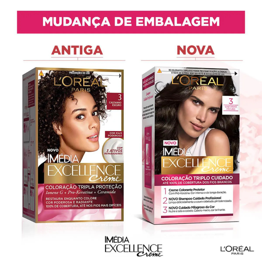 Tintura de Cabelo Imédia Excellence 3 Castanho Escuro – Cor profunda com tratamento triplo para seus fios A Tintura Imédia Excellence 3 Castanho Escuro da L’Oréal Paris oferece um resultado de coloração intenso, duradouro e com aparência natural. Desenvolvida com a exclusiva tecnologia de Triplo Cuidado, protege o couro cabeludo, fortalece os fios e sela a cor, proporcionando um visual sofisticado com tratamento completo. Principais Características: - Cor Castanho Escuro Rica e Intensa: Realça a beleza dos fios com um tom profundo, uniforme e com brilho tridimensional. - Cobertura Total dos Fios Brancos: Eficácia comprovada desde a primeira aplicação, garantindo um visual impecável. - Tecnologia Triplo Cuidado: Proteção antes, durante e após a coloração, com ativos fortalecedores e nutritivos. Benefícios: - Fortalece a fibra capilar e mantém a saúde dos fios durante a coloração. - Resultado duradouro com brilho intenso. - Cabelos tratados, macios e com aparência de salão. - Ideal para todos os tipos de cabelo. Diferenciais do Produto: - Com Pró-Queratina, Ceramida e Ionene G: Promove reparação profunda e proteção total. - Inclui shampoo e condicionador de tratamento: Remove resíduos, sela a cutícula e prolonga a intensidade da cor. - Aplicação fácil e prática em casa. Especificações Técnicas: - Peso: 180g Instruções de Uso: - Faça o teste de alergia 48h antes da aplicação. - Misture o creme colorante com a emulsão reveladora conforme o folheto. - Aplique nos cabelos secos, seguindo as instruções e respeitando o tempo indicado. - Enxágue bem, utilize o shampoo cuidado profundo e finalize com o condicionador. Avisos e Precauções: - Produto para uso capilar. - Não aplicar em sobrancelhas ou cílios. - Evitar contato com os olhos. - Manter fora do alcance de crianças. - Uso externo. Em caso de irritação, suspenda o uso e consulte um médico. O que está incluso? - 1 Creme Colorante 48g - 1 Emulsão Reveladora 72ml - 1 Shampoo Cuidado Profundo 12ml - 1 Condicionador Cuidado Profundo 40ml - 1 Par de Luvas - 1 Folheto Explicativo ---- DÚVIDAS FREQUENTES ---- Os produtos são originais? Sim. Todos os nossos produtos são originais. Emitem nota fiscal? Sim. Emitimos nota fiscal para todos os pedidos.