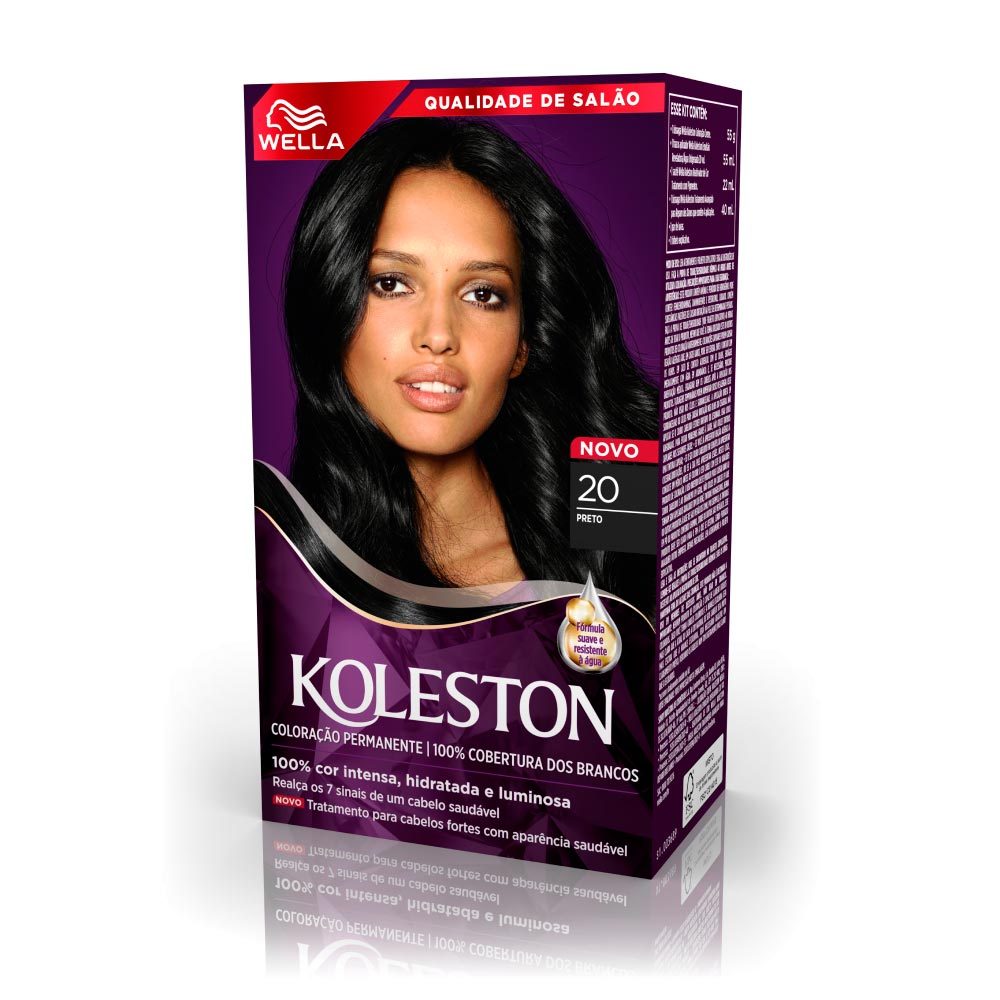 TINTURA CREME KOLESTON WELLA PRETO 20 Cor intensa e duradoura. Perfeita cobertura dos cabelos brancos. Koleston tem um reativador de cor! Reative a sua cor entre as colorações, depositando mais pigmen