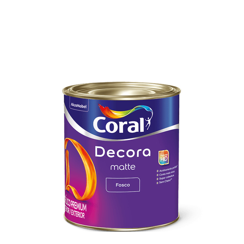 Desde as primeiras pinceladas você percebe que irá atingir os resultados que planejou. Coral Decora Matte é um creme de pintura que espalha facilmente pelas paredes resultando em um acabamento uniforme. Você pinta sem complicação porque não precisa diluir, tem baixo respingamento e pode até ser aplicado diretamente sobre o mofo, sem necessidade de limpeza prévia da parede. Rende até 5,5 m² acabados por embalagem de 800ML. Principais Vantagens - Mais praticidade - Pronto para uso não precisa diluir (Caso prefira, dilua no máximo até 10%) - Pinta até sobre o mofo - Sem necessidade de limpeza prévia - Paredes mais bonitas - Acabamento uniforme - Baixo respingamento - Menos sujeira Acabamento Fosco Rendimento por demão Até 3m2 por demão Conteúdo 800ML Tempo de secagem 30 minutos ao toque, 4 horas entre demãos, 4 horas final Número de demãos 2 a 3 demão Ferramentas Recomendadas Rolo de lã de pelo baixo, pincel ou trincha