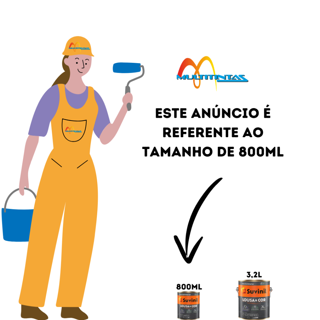 **ATENÇÃO, CASO QUEIRA UMA COR QUE NÃO ESTÁ NO ANÚNCIO, NOS ENVIE UMA MENSAGEM**Já imaginou transformar as paredes da sua casa ou do seu empreendimento em um grande quadro com desenhos, frases e muito mais? Ao investir em uma tinta-lousa, você dá cor às superfícies e ainda garante um mural cheio de estilo! Na Suvinil, você encontra a tinta Esmalte Suvinil Lousa e Cor, uma solução capaz de transformar suas paredes em um verdadeiro painel de histórias.Indicado para superfícies internas e externas, o produto possui baixo odor, secagem rápida e fácil aplicação, garantindo ainda mais estilo e personalidade para os ambientes.IndicaçãoSendo uma opção de tinta para escrever com giz, o Esmalte Suvinil Lousa e Cor pode ser aplicado no quarto, no escritório, na cozinha ou em qualquer outro ambiente, dentro e fora de casa. Ele também é indicado para trazer beleza e proteção às superfícies de alumínio, galvanizado, madeiras, metais ferrosos e PVC. Ou seja, muitas superfícies podem virar uma lousa com essa tinta.DiluiçãoDisponível em embalagens de 800 mL e 3,2 L, a tinta-lousa da Suvinil deve ser diluída antes da aplicação. Para isso, o recomendado é seguir as instruções presentes na embalagem, diluindo-a com 10% ou 30% de água potável (em casos de aplicação com pistola de pressão).Como aplicar o Esmalte Suvinil Lousa e Cor?Na hora de aplicar a tinta-lousa Esmalte Suvinil Lousa e Cor, comece verificando as condições da superfície, certificando-se que não apresenta mofo, infiltrações e outras patologias. Depois, lixe-a e limpe para retirar o pó, prepare-a com um fundo preparador e comece o processo de pintura com a ajuda de um rolo de espuma, lã de carneiro ou pincel.Acabamento:-AcetinadoSecagem:-Ao toque: 30 minutos-Entre demãos: 2 horas-Final: 5 horasRendimento acabado:-Até 17 m²Quantidade necessária de demãos:-2 a 3Diluição:-Dilua com 10% de água potável. Airless: 30% *As cores nas imagens são apenas referências, podendo existir variações em relação a cor do produto em telas do computador/celular e luminosidade do ambiente.