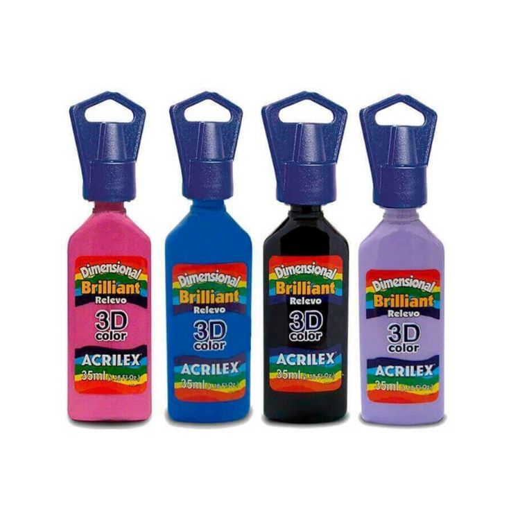 Tinta Dimensional 3D Brilliant 35ml ACRILEX Resistente à lavagens. Apresentada em 3 versões: Brilliant, Metallic e Glitter. Pronta para uso. Modo de Usar: Aplique diretamente com o bico aplicador sobre a superfície a ser trabalhada. Secagem em 24 horas. Para tecidos: utilizar tecidos 100% algodão e sem goma. Aguardar 72 horas para lavagem, após a aplicação do produto. Tinta com efeito relevo. Qualquer tipo de material poroso e aderente, como tecidos de algodão, madeira, cerâmica, gesso, papel, papelão, isopor, etc. Pode ser aplicada em telas, pintadas com tintas acrílicas para tela. Não pode ser aplicada em tecidos sintéticos ou engomados. Pode ser aplicada formando traços, pontos e grafismos. Pode ser usada para confecção de adesivos permanentes, fixá-los em superfícies lisas e não aderentes como vidro, plástico, acrílico, etc.