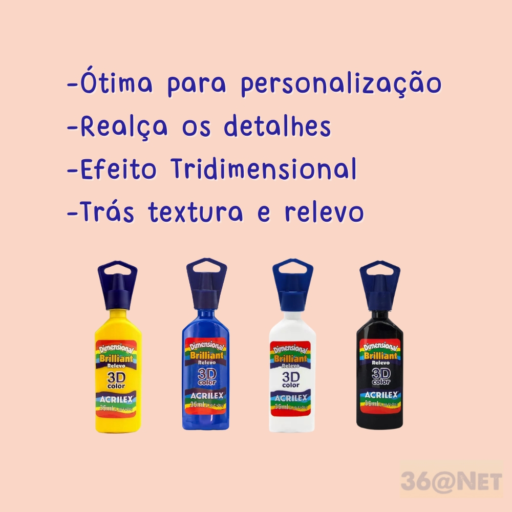 TINTA DIMENSIONAL RELEVO 3D BRILLIANT ACRILEX 35ML ***VENDA UNITÁRIA*** CORES DISPONÍVEIS: - Preto - Branco - Amarelo Ouro - Azul Turquesa CARACTERÍSTICAS: - Efeito relevo. - Resistente à lavagens. - Pronta para usar. - Secagem em 24 horas. MODO DE USAR: - Aplique diretamente com o bico aplicador sobre a superfície a ser trabalhada. - Utilizar tecidos 100% algodão e sem goma. Aguardar 72 horas para lavagem, após a aplicação do produto. - Use em qualquer tipo de material poroso e aderente, como tecidos de algodão, madeira, cerâmica, gesso, papel, papelão, isopor, etc. - Pode ser aplicada em telas, pintadas com tintas acrílicas para tela. Não pode ser aplicada em tecidos sintéticos ou engomados. - Pode ser aplicada formando traços, pontos e grafismos. A validade das tintas podem variar dentro do período de 04/2025 a 10/2025 ENVIO RÁPIDO! Pedidos feitos de domingo a quinta são enviados em até 24 horas. Pedidos feitos às sextas, sábados ou feriados serão enviados no próximo dia útil. Ainda com dúvidas ??? Fale com nossos consultores pelo chat! Acesse agora a nossa loja e conheça todos os nossos produtos! Temos linha de Papelaria, Escolar, Escritório, Artesanato, Brinquedos, etc. *Imagens Meramente Ilustrativas
