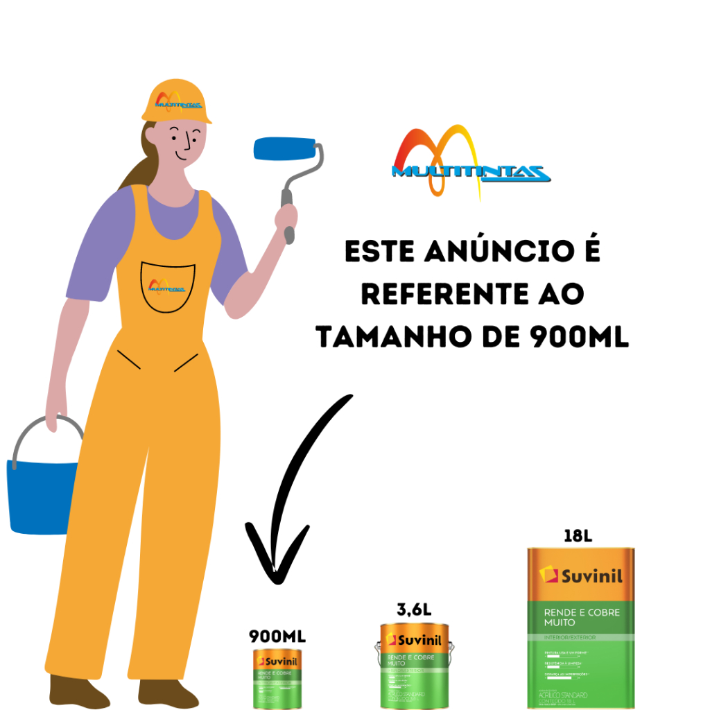 Suvinil Rende & Cobre Muito é a tinta que rende mais. O produto possui baixo odor, uma ótima cobertura e um excelente rendimento e ainda é fácil de espalhar. A Rende & Cobre Muito tem uma ótima consistência, o que facilita a aplicação após a sua diluição. Acabamento: -Fosco Secagem: -Ao toque: 2 horas -Entre demãos: 4 horas -Final: 12 horas Rendimento acabado: -Até 8,5m² Quantidade necessária de demãos: -2 a 3 Diluição: -Primeira pintura sobre massa corrida, acrílica, drywall e gesso: diluia com 30% de água potável. Repintura, concreto, blocos de concreto, fibrocimento e reboco: dilua com 30% e água potável. Para aplicação com airless dilua com 30% de água potável por litro e aplique com pressão entre 1200 e 1400 psi. Use bico com abertura de 0,017” e a velocidade de aplicação entre 9 e 11m2/min.