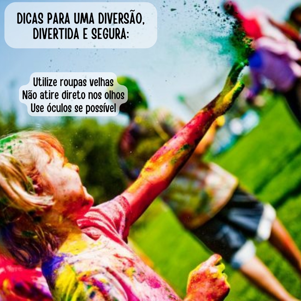 VALOR PARA UMA UNIDADE TINTA EM PÓ DE 100 GRAMAS - Transforme seus projetos em uma explosão de cores com nossa paleta deslumbrante que certamente impressionará. - Liberte sua criatividade com nossas Cores em Pó de alta qualidade, o segredo por trás de obras de arte vibrantes e cheias de vida. - As tintas podem ser utilizadas para diversos fins, para colorir temporariamente o corpo, roupas e ambientes, festas, também podendo ser diluído em agua para ter um liquido colorido. CARACTERÍSTICAS: - NÃO TÓXICO: O pozinho é produzido de amido de milho, água e corantes alimentícios, quais são ingredientes não tóxicos. - BIODEGRADÁVEL: O nosso pozinho Warna não agride o Meio Ambiente, já que é biodegradável. - É LAVÁVEL: Usamos corantes alimentícios na nossa produção, quais não são usados para pintura permanente. Testamos em vários tipos de tecidos e em geral as cores saem com facilidade. Em alguns casos, foi preciso mais que somente água e sabão, no caso, use um tira-manchas. Alguns tecidos podem sofrer uma aderência maior, pedimos o uso de tecidos de algodão (naturais) durante a diversão, já tecidos não naturais tem uma aderência maior e podem sofre danos. - EVITE CONTATO NOS OLHOS E MUCOSA! Para uma boa diversão, evite jogar sobre os olhos de amigos ou qualquer outra pessoa. Caso haja contato, poderá causar incômodo igual qualquer outro material estranho em contato com os olhos, no caso, lavar com água por alguns minutos e/ou usar produtos adequados para limpeza dos olhos. Ao adquirir o produto, você também adquire qualidade e um produto ideal para sua festa ou confraternização! REUSE. REDUZA. RECICLE.