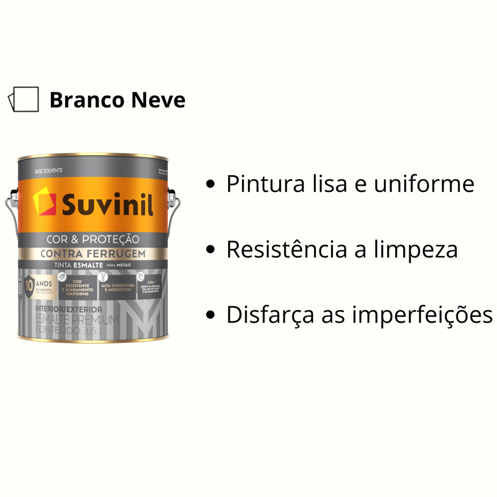 Ela é completa! Pode ser aplicada direto na ferrugem depois de lixar e possui proteção anticorrosiva. Além disso, ela é fácil de limpar e conta com silicone na fórmula – que não deixa sujeiras como fuligem, poluição e poeira grudarem na superfície. Com a Suvinil COR & PROTEÇÃO CONTRA FERRUGEM você renova sua superfície metálica facilitando a pintura porque dispensa o uso de fundo. Tudo isso com 10 anos de garantia. Marca: Suvinil Acabamento: Brilhante Ambiente indicado: Externos e Internos Superfícies indicadas: Possui proteção anticorrosiva e foi especialmente desenvolvido para superfície metálica podendo ser aplicado direto na ferrugem após lixamento. Linha: Cor & Proteção Contra Ferrugem Tipo de Tinta: Esmalte Premium Volume da embalagem: 3,6L Rendimento por demão (3,6): até 75 m² Secagem ao toque: 2 horas Secagem entre demãos: 45 minutos Secagem final: 8 horas É inflamável? Não Ferramenta indicada para aplicação: Rolo de espuma, pincel ou pistola. Números de demãos indicadas: 2 a 3 (O número de demãos pode variar dependendo da superfície e cor escolhida) Densidade: 0.920 - 1.080 g/cm3 VOC - Compostos Orgânicos Voláteis (ABNT NBR 16388): máxima de 480 g/L Diluição: 10% de aguarrás Prazo de Validade (embalagem fechada e sem uso): 48 Meses Tintas para ambientes internos e externos. 02 Tinta Esmalte Contra Ferrugem Branco 3,6L Suvinil
