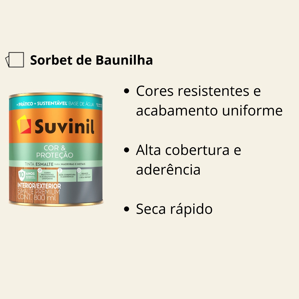 Com Suvinil Esmalte Seca Rápido você curte sua casa renovada mais cedo. A tinta seca em 30 minutos ao toque, não deixa cheiro e não amarela.Suvinil Esmalte Seca Rápido é como pintar em alta velocidade. Sua casa pronta para você curtir mais cedo. A tinta seca em até 30 minutos ao toque, não deixa cheiro e não amarela. Você pode fechar portas e janelas no mesmo dia depois de pintar. Além disso, Esmalte Seca Rápido possui ação fungicida contra fungos, mofos e algas. Sua casa pintada e bem cuidada.*Imagens meramente ilustrativas*Todas as informações divulgadas são de responsabilidade do Fabricante/FornecedorAcabamento: AcetinadoSecagem: Ao toque: 30 minutosEntre demãos: 2 horasFinal: 5 horasRendimento por demão: 800ml: Rendimento até 19 m²Rendimento acabado: 800ml: Rendimento até 19 m²Quantidade necessária de demãos: 2 a 3Diluição: Diluição em água potável. Até 10% em todas as demãos. Para aplicação com pistola diluir 30%, pressão entre 2,2 a 2,8 Kgf/cm² ou 30 a 35 lbs/pol².Tintas para ambientes internos e externos.01 Tinta Esmalte Cor e Proteção Acetinado Sorbet de Baunilha 0,8L Suvinil