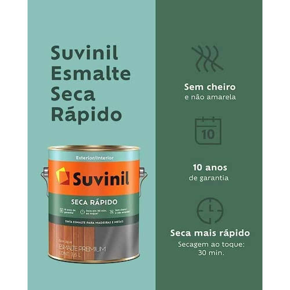 ⚠️ *Produto Personalizado – Sem Direito a Devolução por Arrependimento* Devido à customização de cor conforme sua escolha, não aceitamos devoluções ou trocas por mudança de ideia. Só serão aceitas solicitações em caso de *defeito de fabricação* ou *avaria no transporte*, mediante comprovação. Recomendado para colorir diversos tipos de materiais, o esmalte premium à base de água da Suvinil apresenta alta aderência e nivelamento, deixando o acabamento de qualquer superfície incrível. A nova fórmula do esmalte brilhante ainda garante uma durabilidade maior, tendo substâncias que previnem o descascamento, por exemplo. Dessa forma, você adquire um item com excelente custo benefício em relação à manutenção. Demãos: 2 a 3 demãos Acabamento: Brilhante Diluição: 20% com água potável Rendimento: 3.6 L - 75m² acabados. Secagem: Ao toque: 30 minutos Entre demãos: 2 horas Final: 5 horas
