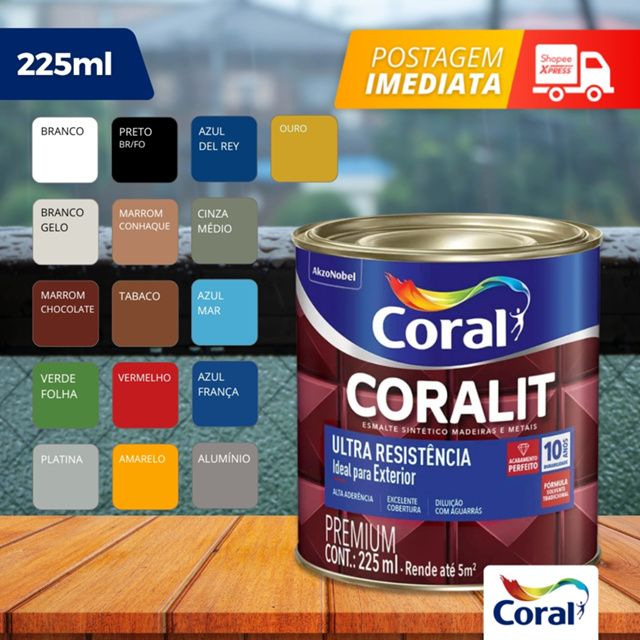 Tinta Esmalte Coralit Madeira e Metais Ultra Resistivo 225ml integra a oferta da Shopee Brasil na subcategoria Tintas e Revestimentos para Paredes (de Casa e Construção) por R$ 26,90 (52% de desconto sobre o preço original de R$ 56,04). Com avaliação de 4.8 de 5 estrelas e 96 unidades vendidas, este produto se destaca pelo excelente custo-benefício.