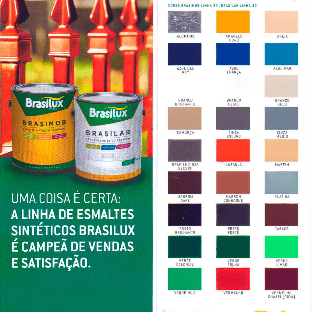 Tinta Esmalte Imobiliário Standard Brasimob 900ml Brasilux Várias Cores Acabamento Alta Qualidade Tinta Esmalte Brasilux Para Madeiras E Metais Brasimob 3,6l Diversas Cores Tinta Esmalte Imobiliário Standard Brasimob Brasilux 3,6L Descrição: A Tinta Esmalte Imobiliário Standard Brasilux 3,6L é indicada para ambientes internos e externos, oferecendo excelente cobertura e acabamento liso e durável. Ideal para pintura de madeira, ferro e alvenaria, garantindo proteção e resistência por muito mais tempo. Características: Marca: Brasilux Linha: Standard Conteúdo: 3,6 litros Acabamento brilhante e resistente Uso interno e externo Alta cobertura e rendimento Secagem rápida Vantagens: Fácil aplicação Alta resistência ao tempo, ferrugem e desgaste Ideal para portas, portões, grades, móveis e paredes Indicado para pintura residencial, comercial e industrial Perguntas frequentes: Pode ser usada em madeira e ferro: Sim Acompanha solvente: Não, vendido separadamente Rendimento médio: até 50 m² por demão Produto ideal para quem busca acabamento profissional, alta durabilidade e facilidade na aplicação. Palavras-chave: tinta esmalte, tinta brasilux, tinta standard, esmalte sintético, tinta 3,6l, tinta brilhante, tinta para madeira, tinta para ferro, tinta para alvenaria, pintura imobiliária, tinta profissional, tinta decorativa, tinta externa, tinta interna, pintura resistente, acabamento brilhante, esmalte imobiliário. Tinta Esmalte Para Madeiras E Metais 3,6l Cores Escolha Tinta Esmalte Sintético Brasimob 3,6l Diversas Cores Comercial Vipasa Distribuidora